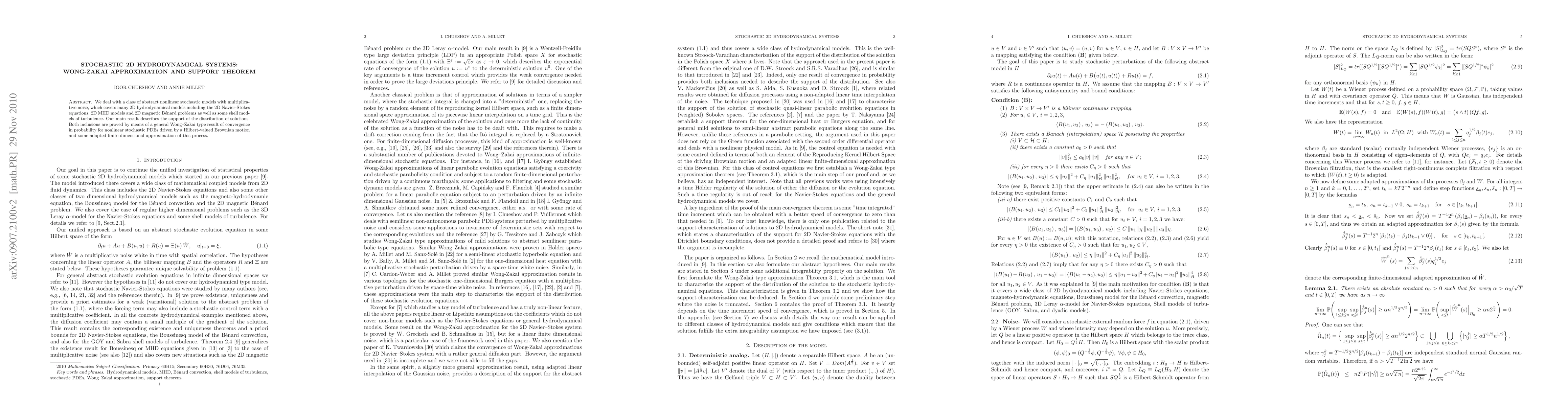 This paper investigates abstract nonlinear stochastic models with multiplicative noise, focusing on 2D hydrodynamical systems like the Navier-Stokes and MHD models. It establishes a Wong-Zakai approximation theorem and a support theorem for the distribution of solutions, proving convergence in probability for a nonlinear stochastic PDE driven by a Hilbert-valued Brownian motion.