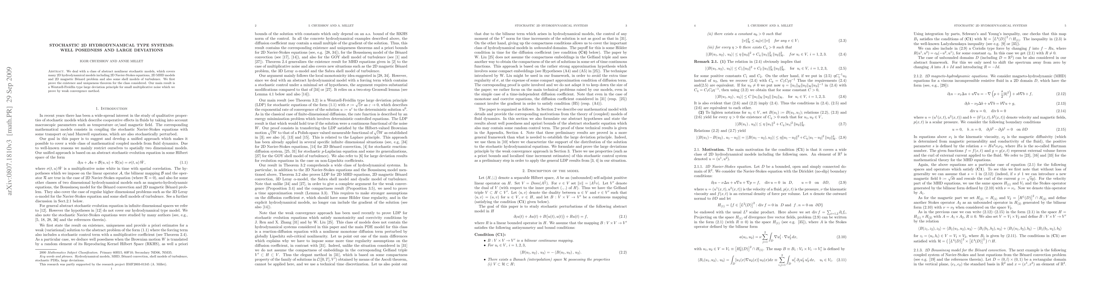 We deal with a class of abstract nonlinear stochastic models, which covers many 2D hydrodynamical models including 2D Navier-Stokes equations, 2D MHD models and 2D magnetic B\'enard problem and also some shell models of turbulence. We first prove the existence and uniqueness theorem for the class considered. Our main result is a Wentzell-Freidlin type large deviation principle for small multiplicative noise which we prove by weak convergence method.