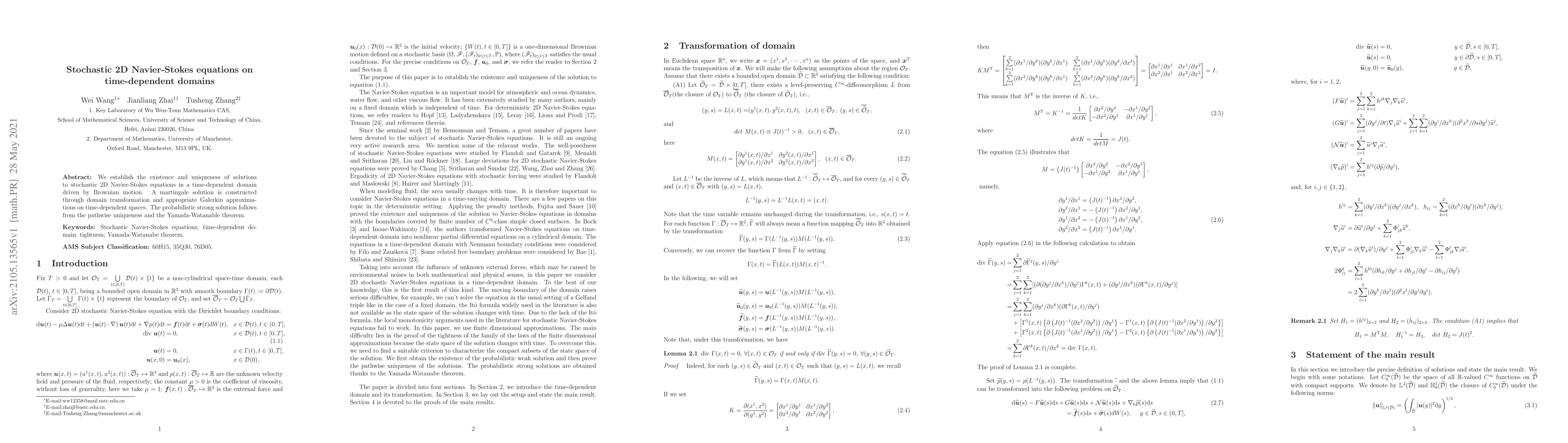 This paper proves the existence and uniqueness of solutions to stochastic 2D Navier-Stokes equations in time-varying domains driven by Brownian motion. The authors construct a martingale solution via domain transformation and Galerkin approximations, leading to a probabilistic strong solution through pathwise uniqueness and the Yamada-Watanabe theorem.