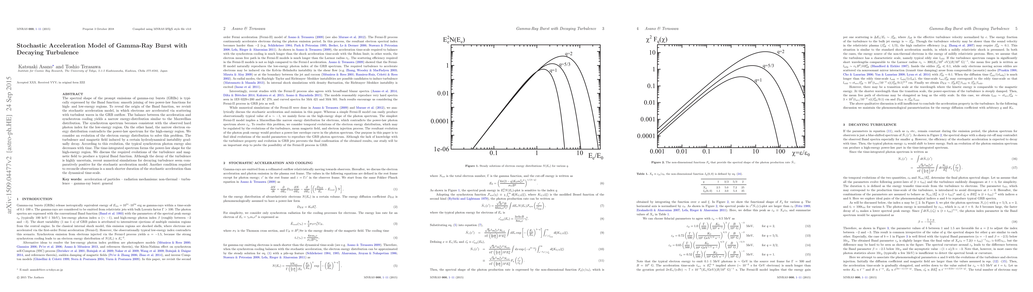 This paper explores the stochastic acceleration model for gamma-ray bursts (GRBs), proposing that decaying turbulence in the GRB outflow can explain the Band function's spectral shape. The model suggests that the evolution of turbulence and magnetic fields over time can produce a time-integrated spectrum consistent with observed high-energy power-law spectra.