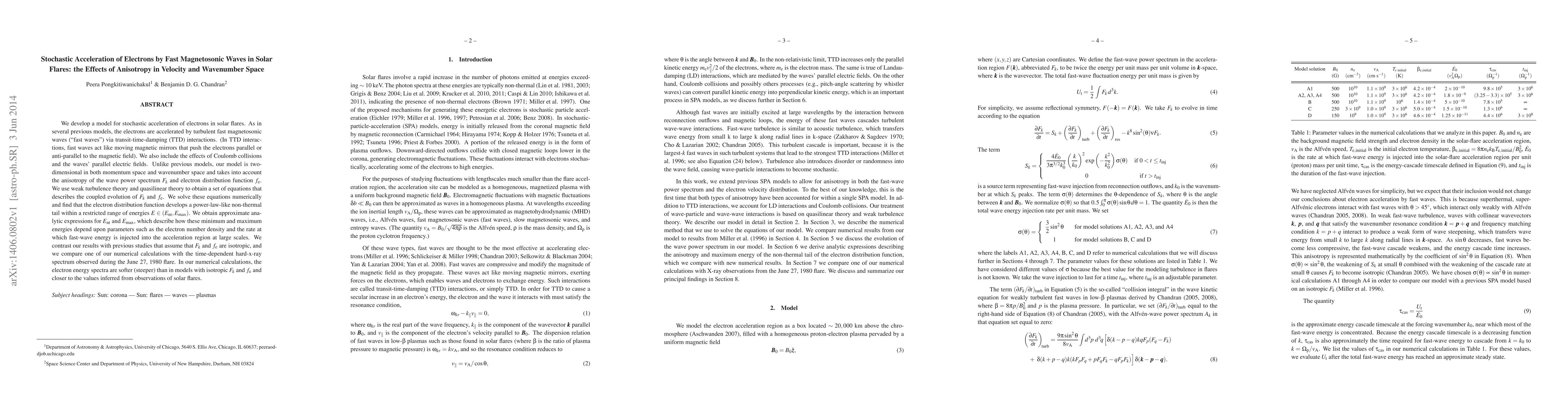 We develop a model for stochastic acceleration of electrons in solar flares. As in several previous models, the electrons are accelerated by turbulent fast magnetosonic waves ("fast waves") via transit-time-damping (TTD) interactions. (In TTD interactions, fast waves act like moving magnetic mirrors that push the electrons parallel or anti-parallel to the magnetic field). We also include the effects of Coulomb collisions and the waves' parallel electric fields. Unlike previous models, our model is two-dimensional in both momentum space and wavenumber space and takes into account the anisotropy of the wave power spectrum $F_k$ and electron distribution function $f_{\rm e}$. We use weak turbulence theory and quasilinear theory to obtain a set of equations that describes the coupled evolution of $F_k$ and $f_{\rm e}$. We solve these equations numerically and find that the electron distribution function develops a power-law-like non-thermal tail within a restricted range of energies $E\in (E_{\rm nt}, E_{\rm max})$. We obtain approximate analytic expressions for $E_{\rm nt}$ and $E_{\rm max}$, which describe how these minimum and maximum energies depend upon parameters such as the electron number density and the rate at which fast-wave energy is injected into the acceleration region at large scales. We contrast our results with previous studies that assume that $F_k$ and $f_{\rm e}$ are isotropic, and we compare one of our numerical calculations with the time-dependent hard-x-ray spectrum observed during the June 27, 1980 flare. In our numerical calculations, the electron energy spectra are softer (steeper) than in models with isotropic $F_k$ and $f_{\rm e}$ and closer to the values inferred from observations of solar flares.