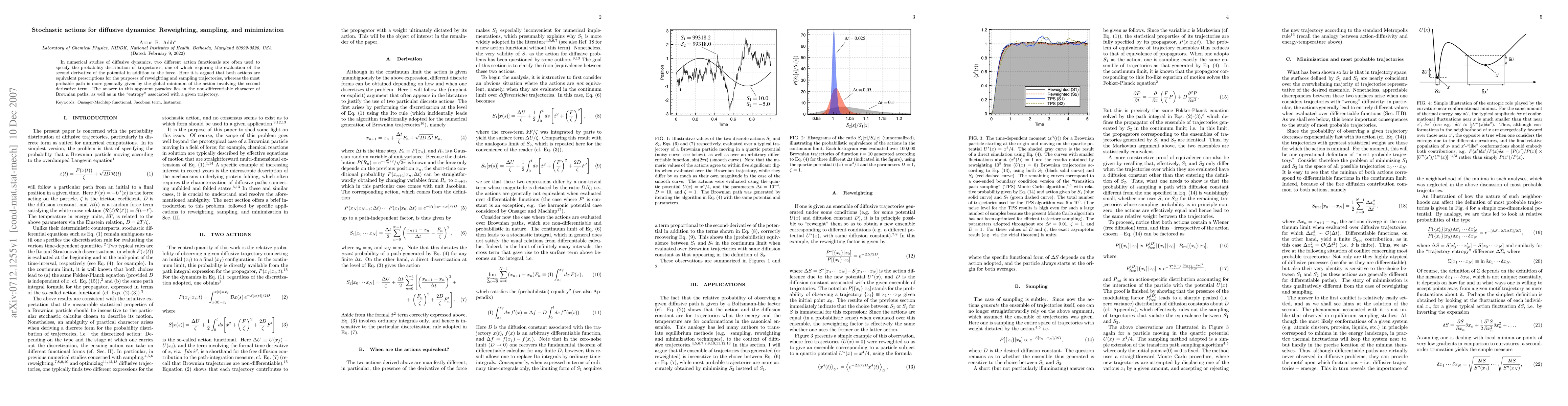 In numerical studies of diffusive dynamics, two different action functionals are often used to specify the probability distribution of trajectories, one of which requiring the evaluation of the second derivative of the potential in addition to the force. Here it is argued that both actions are equivalent prescriptions for the purposes of reweighting and sampling trajectories, whereas the most probable path is more generally given by the global minimum of the action involving the second derivative term. The answer to this apparent paradox lies in the non-differentiable character of Brownian paths, as well as in the "entropy" associated with a given trajectory.