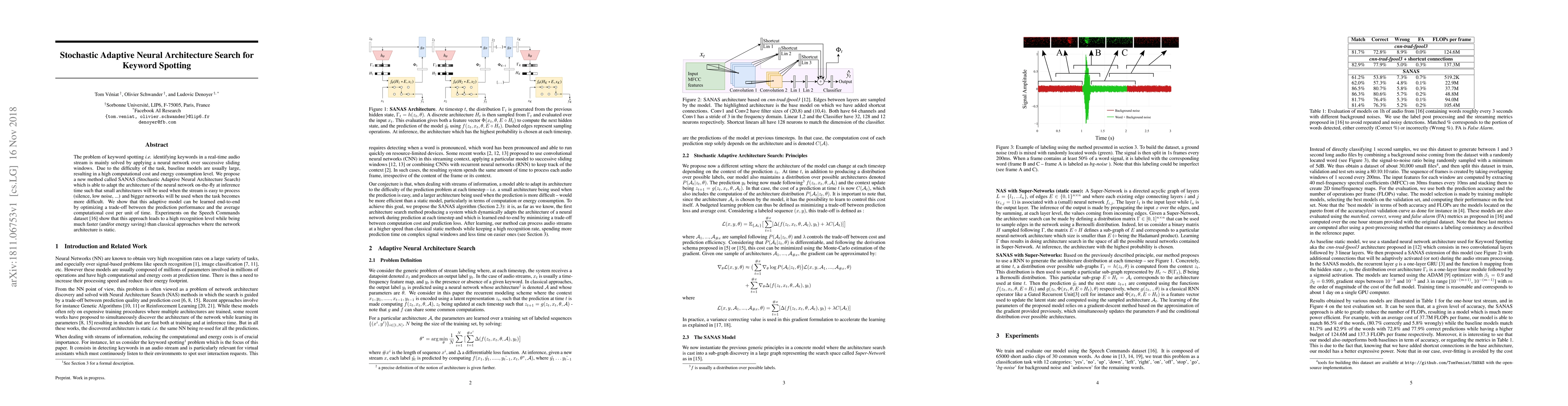 The paper proposes SANAS, a Stochastic Adaptive Neural Architecture Search method for keyword spotting in audio streams, which dynamically adjusts neural network architecture to optimize performance and computational efficiency. Experimental results on the Speech Commands dataset demonstrate high recognition accuracy while significantly reducing computational cost and energy consumption compared to static network approaches.