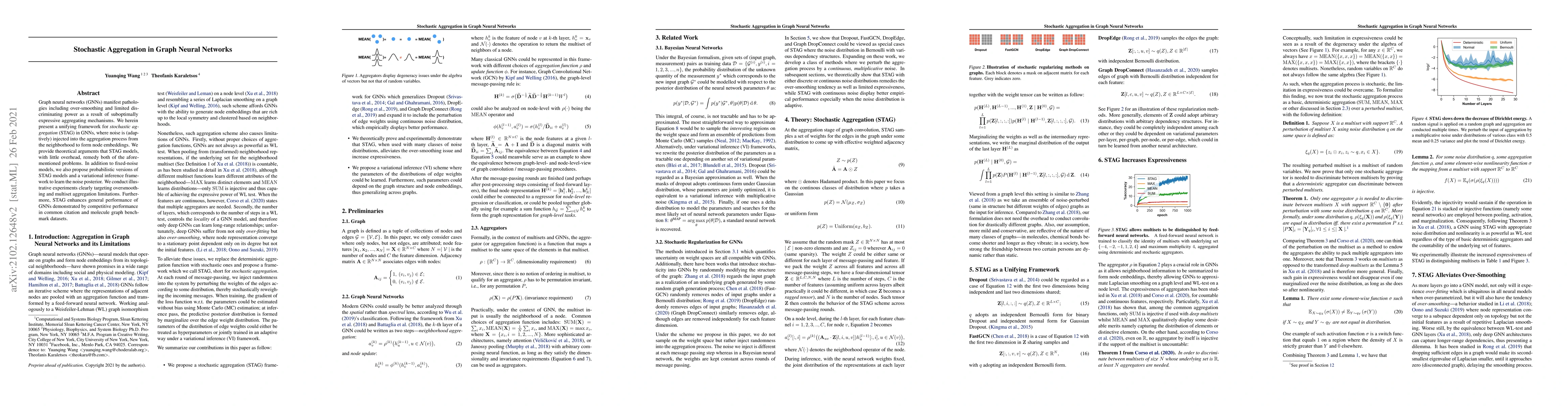 Graph neural networks (GNNs) manifest pathologies including over-smoothing and limited discriminating power as a result of suboptimally expressive aggregating mechanisms. We herein present a unifying framework for stochastic aggregation (STAG) in GNNs, where noise is (adaptively) injected into the aggregation process from the neighborhood to form node embeddings. We provide theoretical arguments that STAG models, with little overhead, remedy both of the aforementioned problems. In addition to fixed-noise models, we also propose probabilistic versions of STAG models and a variational inference framework to learn the noise posterior. We conduct illustrative experiments clearly targeting oversmoothing and multiset aggregation limitations. Furthermore, STAG enhances general performance of GNNs demonstrated by competitive performance in common citation and molecule graph benchmark datasets.