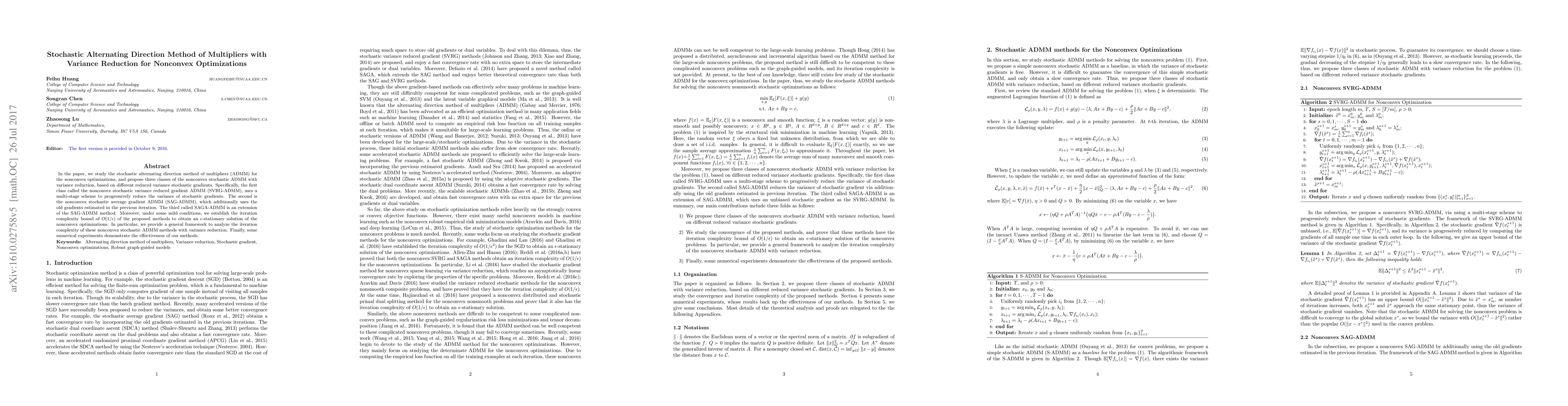 This paper proposes three classes of nonconvex stochastic ADMM methods with variance reduction: SVRG-ADMM, SAG-ADMM, and SAGA-ADMM. The methods progressively reduce the variance of stochastic gradients and achieve an iteration complexity of $O(1/\epsilon)$ for $\epsilon$-stationary solutions. Numerical experiments validate their effectiveness.