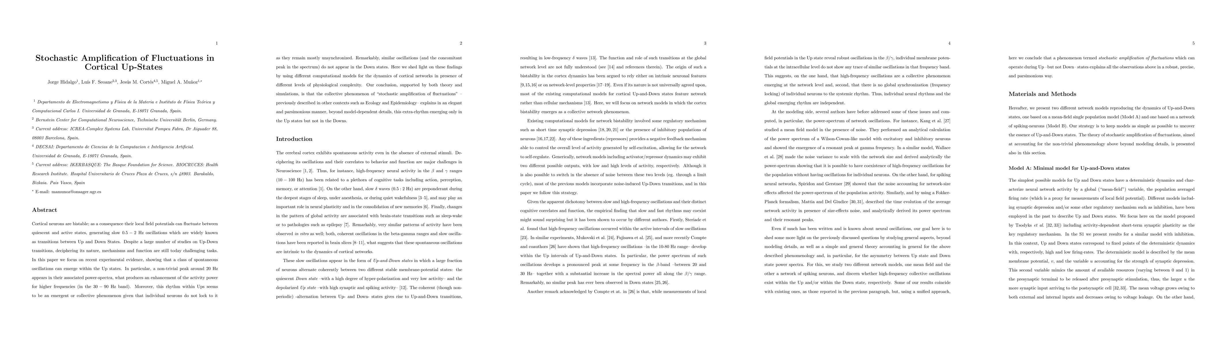 Cortical neurons are bistable; as a consequence their local field potentials can fluctuate between quiescent and active states, generating slow 0.5-2 Hz oscillations which are widely known as transitions between Up and Down States. Despite a large number of studies on Up-Down transitions, deciphering its nature, mechanisms and function are still today challenging tasks. In this paper we focus on recent experimental evidence, showing that a class of spontaneous oscillations can emerge within the Up states. In particular, a non-trivial peak around 20 Hz appears in their associated power-spectra, what produces an enhancement of the activity power for higher frequencies (in the 30-90 Hz band). Moreover, this rhythm within Ups seems to be an emergent or collective phenomenon given that individual neurons do not lock to it as they remain mostly unsynchronized. Remarkably, similar oscillations (and the concomitant peak in the spectrum) do not appear in the Down states. Here we shed light on these findings by using different computational models for the dynamics of cortical networks in presence of different levels of physiological complexity. Our conclusion, supported by both theory and simulations, is that the collective phenomenon of "stochastic amplification of fluctuations" -previously described in other contexts such as Ecology and Epidemiology-- explains in an elegant and parsimonious manner, beyond model-dependent details, this extra-rhythm emerging only in the Up states but not in the Downs.