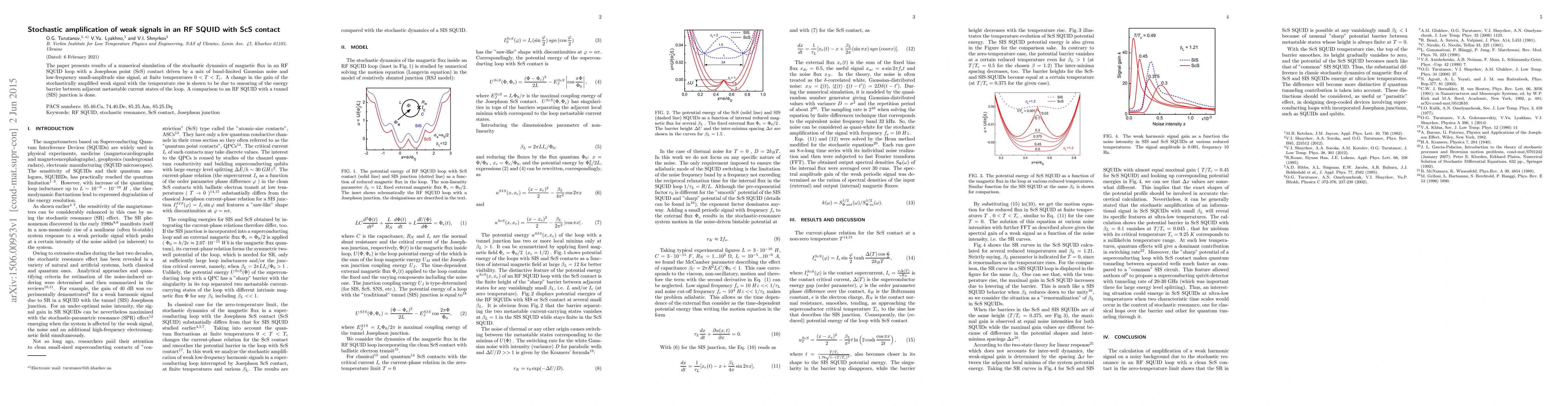 This paper investigates the stochastic dynamics of an RF SQUID with a ScS contact, showing how temperature affects the amplification of weak signals through energy barrier smearing. It compares these results to an RF SQUID with an SIS junction, highlighting differences in signal amplification behavior.