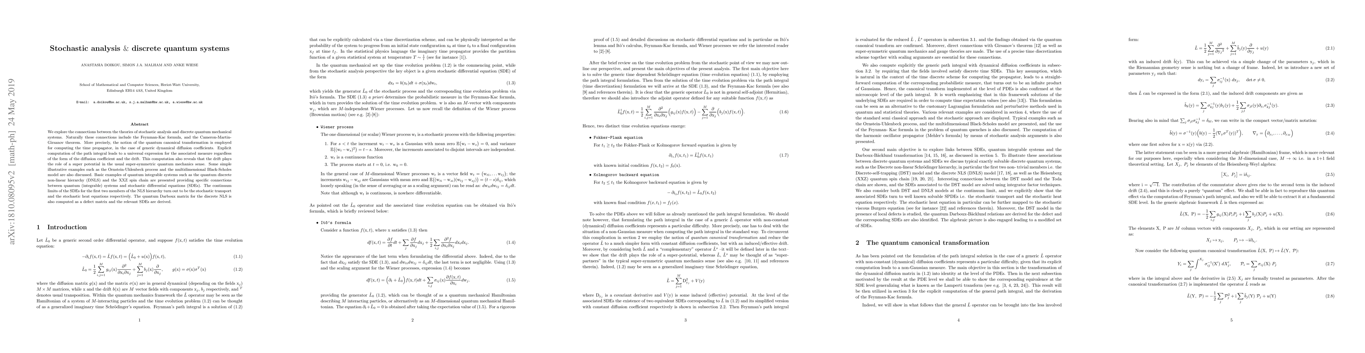 We explore the connections between the theories of stochastic analysis and discrete quantum mechanical systems. Naturally these connections include the Feynman-Kac formula, and the Cameron-Martin-Girsanov theorem. More precisely, the notion of the quantum canonical transformation is employed for computing the time propagator, in the case of generic dynamical diffusion coefficients. Explicit computation of the path integral leads to a universal expression for the associated measure regardless of the form of the diffusion coefficient and the drift. This computation also reveals that the drift plays the role of a super potential in the usual super-symmetric quantum mechanics sense. Some simple illustrative examples such as the Ornstein-Uhlenbeck process and the multidimensional Black-Scholes model are also discussed. Basic examples of quantum integrable systems such as the quantum discrete non-linear hierarchy (DNLS) and the XXZ spin chain are presented providing specific connections between quantum (integrable) systems and stochastic differential equations (SDEs). The continuum limits of the SDEs for the first two members of the NLS hierarchy turn out to be the stochastic transport and the stochastic heat equations respectively. The quantum Darboux matrix for the discrete NLS is also computed as a defect matrix and the relevant SDEs are derived.