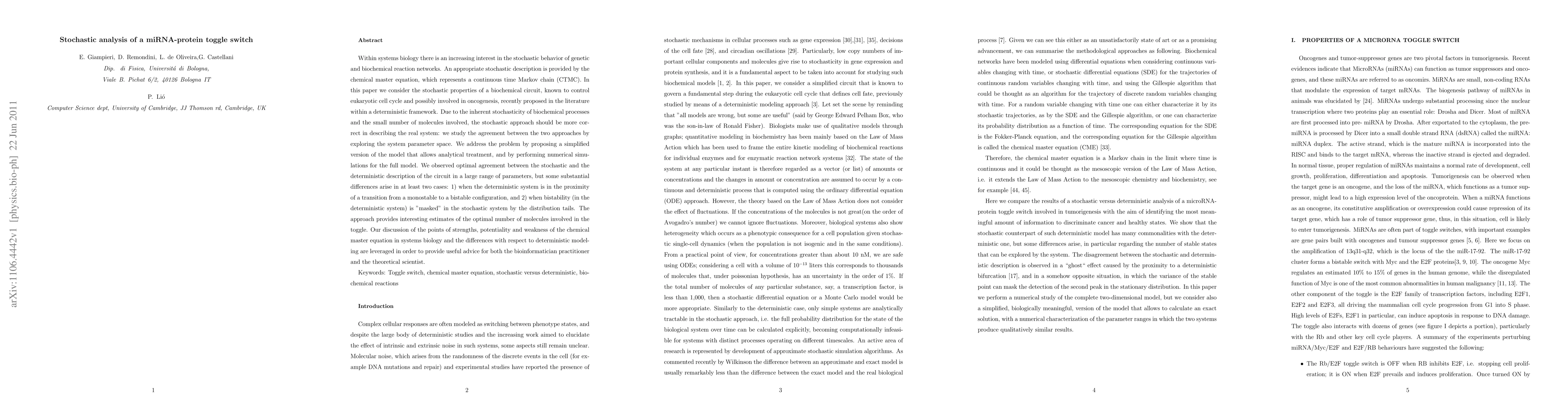 Within systems biology there is an increasing interest in the stochastic behavior of genetic and biochemical reaction networks. An appropriate stochastic description is provided by the chemical master equation, which represents a continuous time Markov chain (CTMC). In this paper we consider the stochastic properties of a biochemical circuit, known to control eukaryotic cell cycle and possibly involved in oncogenesis, recently proposed in the literature within a deterministic framework. Due to the inherent stochasticity of biochemical processes and the small number of molecules involved, the stochastic approach should be more correct in describing the real system: we study the agreement between the two approaches by exploring the system parameter space. We address the problem by proposing a simplified version of the model that allows analytical treatment, and by performing numerical simulations for the full model. We observed optimal agreement between the stochastic and the deterministic description of the circuit in a large range of parameters, but some substantial differences arise in at least two cases: 1) when the deterministic system is in the proximity of a transition from a monostable to a bistable configuration, and 2) when bistability (in the deterministic system) is "masked" in the stochastic system by the distribution tails. The approach provides interesting estimates of the optimal number of molecules involved in the toggle. Our discussion of the points of strengths, potentiality and weakness of the chemical master equation in systems biology and the differences with respect to deterministic modeling are leveraged in order to provide useful advice for both the bioinformatician practitioner and the theoretical scientist.