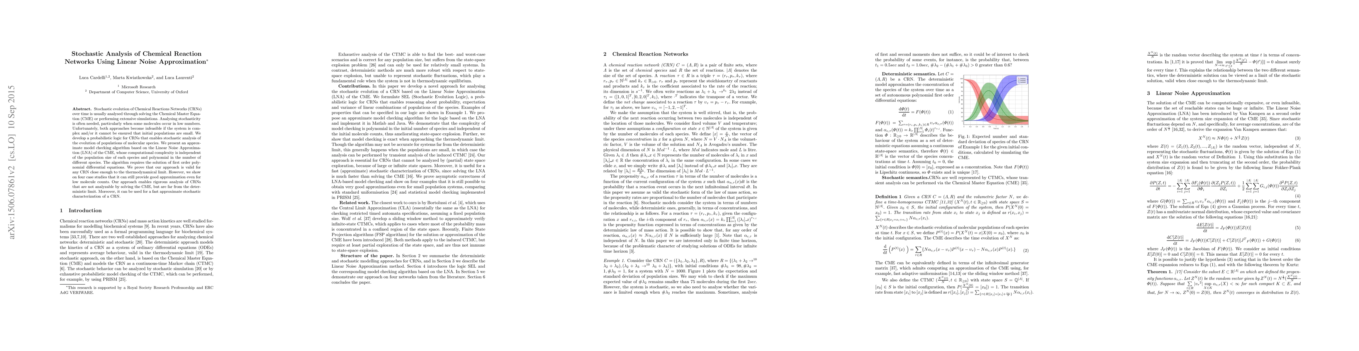 Stochastic evolution of Chemical Reactions Networks (CRNs) over time is usually analysed through solving the Chemical Master Equation (CME) or performing extensive simulations. Analysing stochasticity is often needed, particularly when some molecules occur in low numbers. Unfortunately, both approaches become infeasible if the system is complex and/or it cannot be ensured that initial populations are small. We develop a probabilistic logic for CRNs that enables stochastic analysis of the evolution of populations of molecular species. We present an approximate model checking algorithm based on the Linear Noise Approximation (LNA) of the CME, whose computational complexity is independent of the population size of each species and polynomial in the number of different species. The algorithm requires the solution of first order polynomial differential equations. We prove that our approach is valid for any CRN close enough to the thermodynamical limit. However, we show on four case studies that it can still provide good approximation even for low molecule counts. Our approach enables rigorous analysis of CRNs that are not analyzable by solving the CME, but are far from the deterministic limit. Moreover, it can be used for a fast approximate stochastic characterization of a CRN.