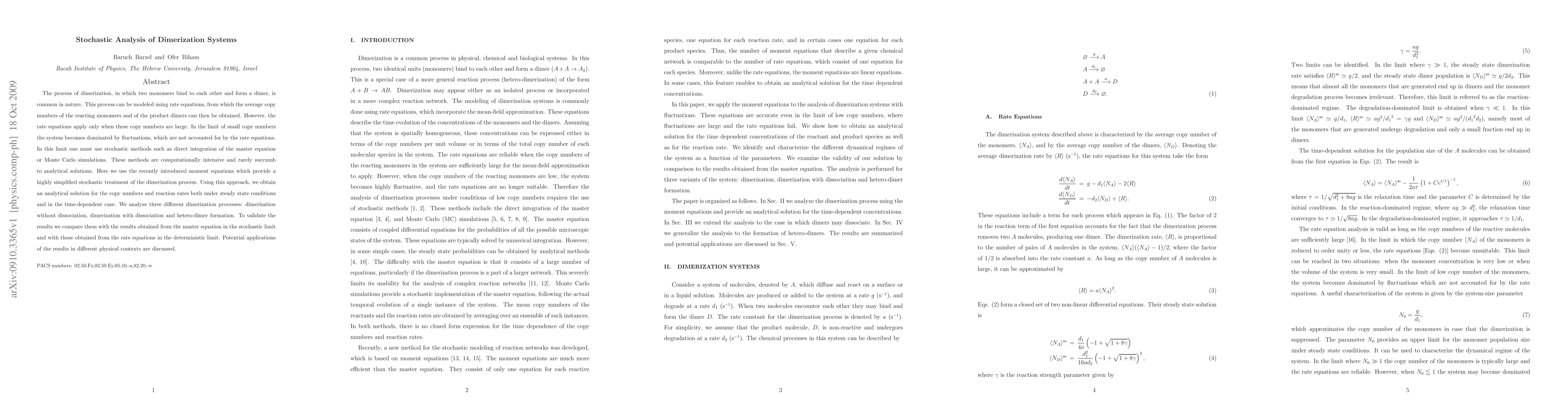 The process of dimerization, in which two monomers bind to each other and form a dimer, is common in nature. This process can be modeled using rate equations, from which the average copy numbers of the reacting monomers and of the product dimers can then be obtained. However, the rate equations apply only when these copy numbers are large. In the limit of small copy numbers the system becomes dominated by fluctuations, which are not accounted for by the rate equations. In this limit one must use stochastic methods such as direct integration of the master equation or Monte Carlo simulations. These methods are computationally intensive and rarely succumb to analytical solutions. Here we use the recently introduced moment equations which provide a highly simplified stochastic treatment of the dimerization process. Using this approach, we obtain an analytical solution for the copy numbers and reaction rates both under steady state conditions and in the time-dependent case. We analyze three different dimerization processes: dimerization without dissociation, dimerization with dissociation and hetero-dimer formation. To validate the results we compare them with the results obtained from the master equation in the stochastic limit and with those obtained from the rate equations in the deterministic limit. Potential applications of the results in different physical contexts are discussed.