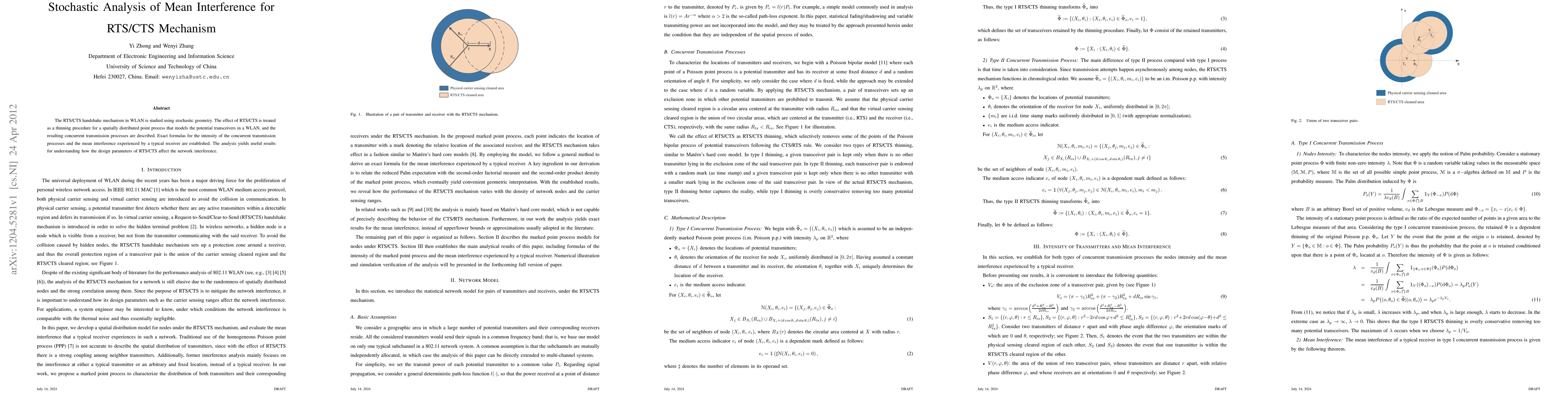This paper employs stochastic geometry to analyze the RTS/CTS mechanism in WLAN, establishing exact formulas for concurrent transmission intensity and mean interference. The study reveals how RTS/CTS design parameters influence network interference.