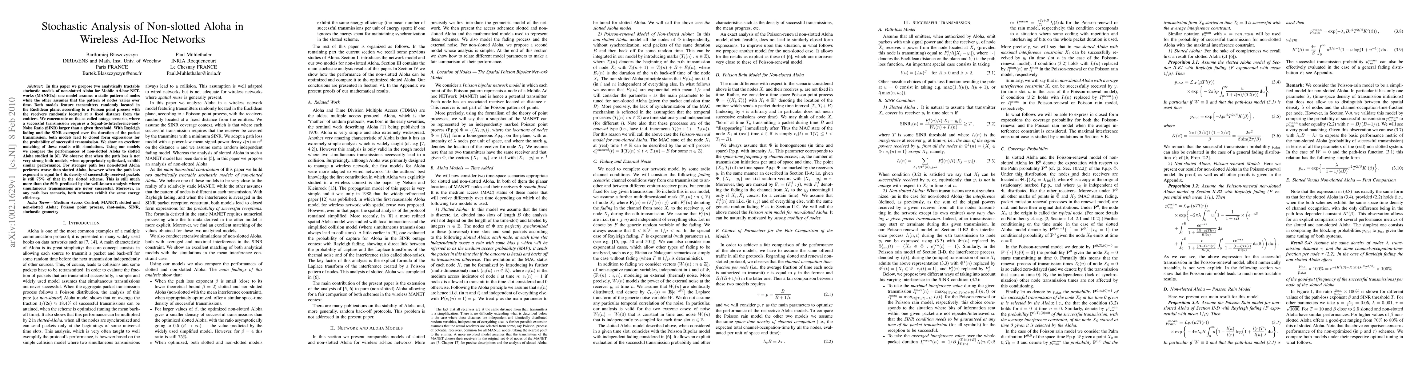 This paper develops two stochastic models for non-slotted Aloha in MANETs, comparing static and dynamic node patterns. It finds that optimized non-slotted Aloha can perform similarly to slotted Aloha under moderate path loss, maintaining 75% of the successful packet density compared to slotted Aloha under strong path loss.
