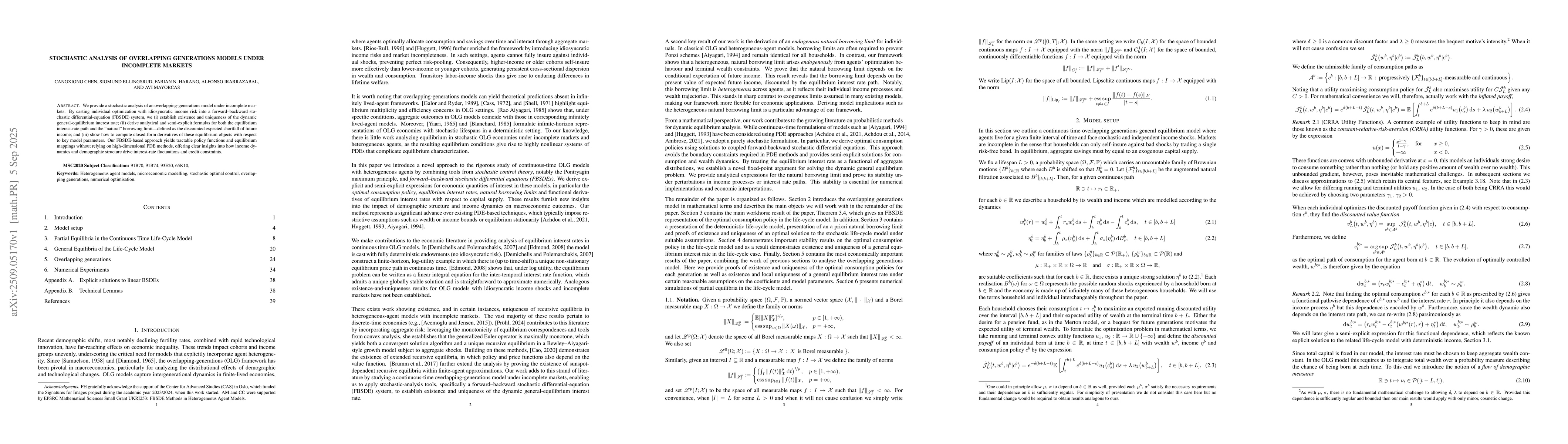 We provide a stochastic analysis of an overlapping-generations model under incomplete markets. By casting individual optimisation with idiosyncratic income risk into a forward-backward stochastic differential equation (FBSDE) system, we (i) establish existence and uniqueness of the dynamic general-equilibirum interest rate and (ii) derive semi-explicit formulas for both the equilibrium interest rate path and the natural borrowing limit - defined as the discounted expected shortfall of future income. Our FBSDE-based approach yields tractable policy functions and equilibrium mappings without relying on high-dimensional PDE methods, offering clear insights into how income dynamics and demographic structure drive intereate-rate fluctuations and credit constraints.