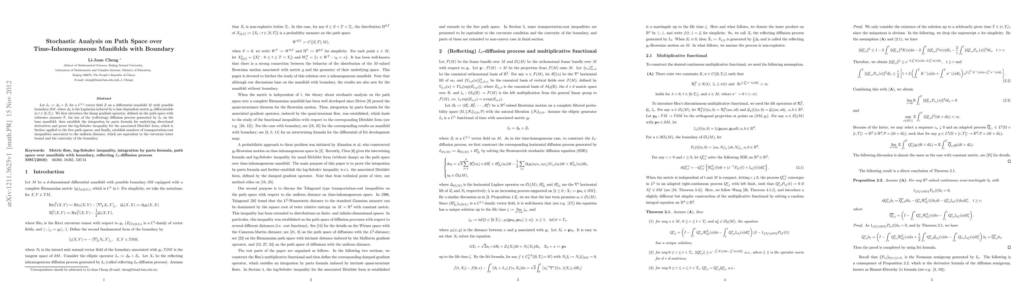 Let $L_t:=\Delta_t+Z_t$ for a $C^{1,1}$-vector field $Z$ on a differential manifold $M$ with possible boundary $\partial M$, where $\Delta_t$ is the Laplacian induced by a time dependent metric $g_t$ differentiable in $t\in [0,T_c)$. We first introduce the damp gradient operator, defined on the path space with reference measure $\mathbb{P}$, the law of the (reflecting) diffusion process generated by $L_t$ on the base manifold; then establish the integration by parts formula for underlying directional derivatives and prove the log-Sobolev inequality for the associated Dirichlet form, which is further applied to the free path spaces; and finally, establish numbers of transportation-cost inequalities associated to the uniform distance, which are equivalent to the curvature lower bound and the convexity of the boundary.