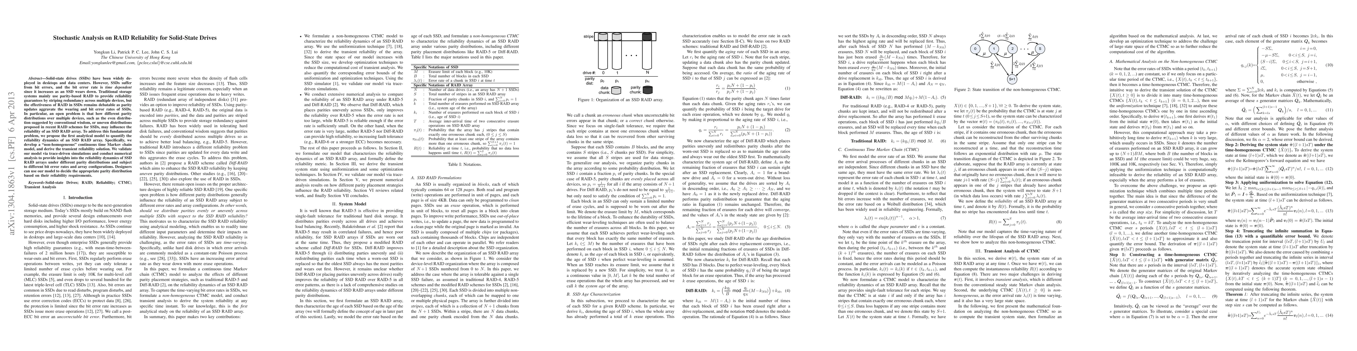 This paper proposes an analytical model using a non-homogeneous continuous time Markov chain to quantify the reliability dynamics of SSD RAID arrays, addressing the impact of different parity distributions on reliability as SSDs wear down. The model is validated through simulations, offering insights for designers to choose optimal parity distributions based on specific reliability needs.