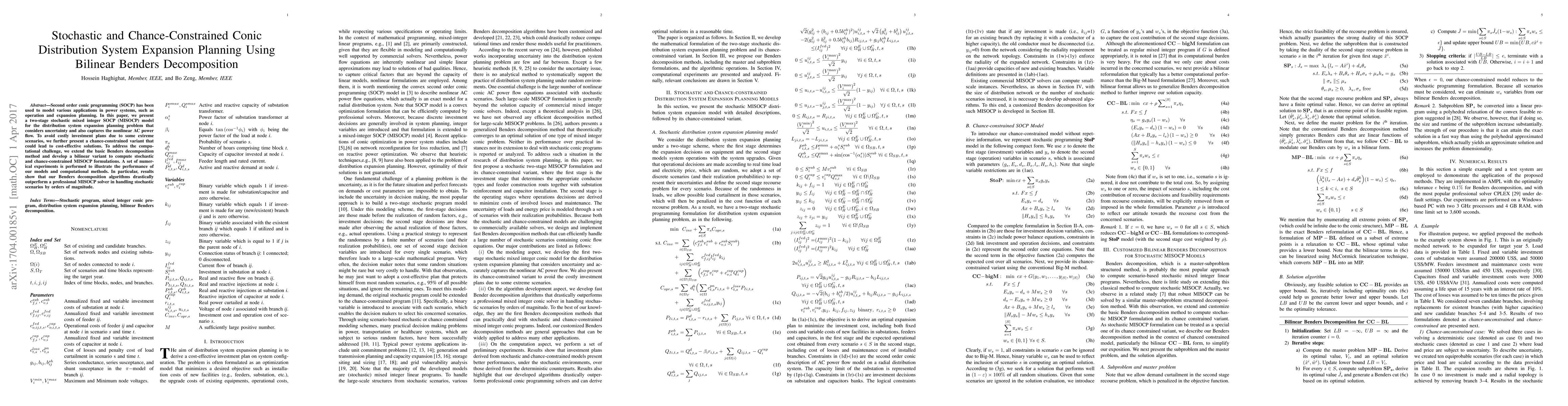 This paper proposes a two-stage stochastic mixed integer second order conic programming model for distribution system expansion planning, incorporating chance constraints to avoid extreme scenarios. It introduces a bilinear Benders decomposition method to efficiently solve the model, demonstrating significant computational improvements over traditional solvers.