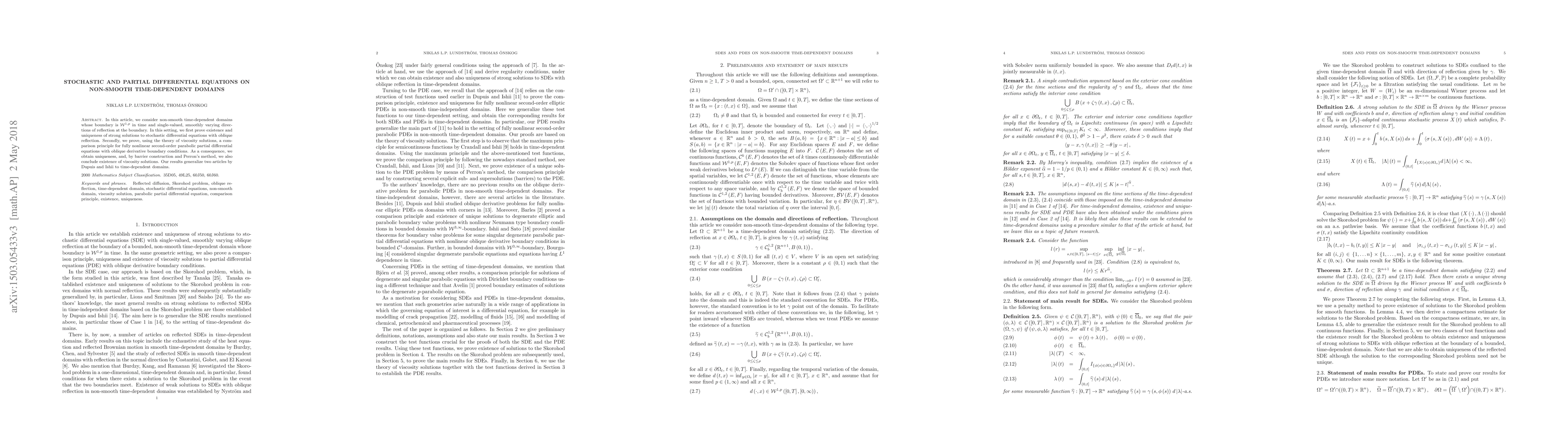 This paper proves existence and uniqueness of strong solutions for stochastic differential equations with oblique reflection on non-smooth, time-dependent domains. It also establishes a comparison principle for fully nonlinear parabolic partial differential equations with oblique boundary conditions, extending previous results by Dupuis and Ishii to time-dependent settings.