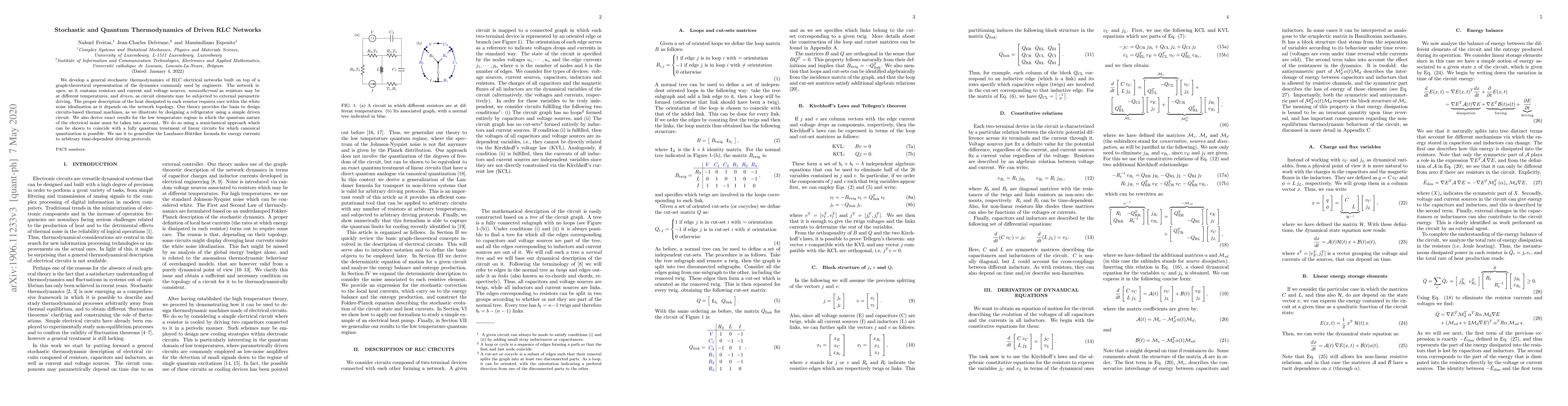 We develop a general stochastic thermodynamics of RLC electrical networks built on top of a graph-theoretical representation of the dynamics commonly used by engineers. The network is: open, as it contains resistors and current and voltage sources, nonisothermal as resistors may be at different temperatures, and driven, as circuit elements may be subjected to external parametric driving. The proper description of the heat dissipated in each resistor requires care within the white noise idealization as it depends on the network topology. Our theory provides the basis to design circuits-based thermal machines, as we illustrate by designing a refrigerator using a simple driven circuit. We also derive exact results for the low temperature regime in which the quantum nature of the electrical noise must be taken into account. We do so using a semiclassical approach which can be shown to coincide with a fully quantum treatment of linear circuits for which canonical quantization is possible. We use it to generalize the Landauer-Buttiker formula for energy currents to arbitrary time-dependent driving protocols.