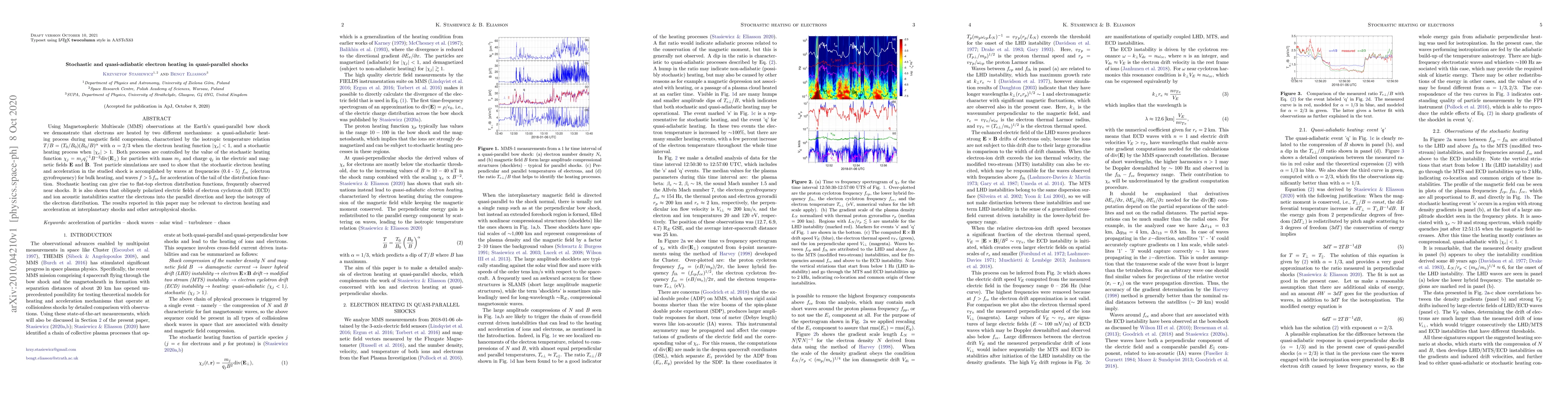 This paper uses MMS observations to show two electron heating mechanisms in quasi-parallel shocks: quasi-adiabatic heating during magnetic field compression and stochastic heating driven by electric fields. Stochastic heating is facilitated by waves at specific frequencies, leading to flat-top electron distribution functions.