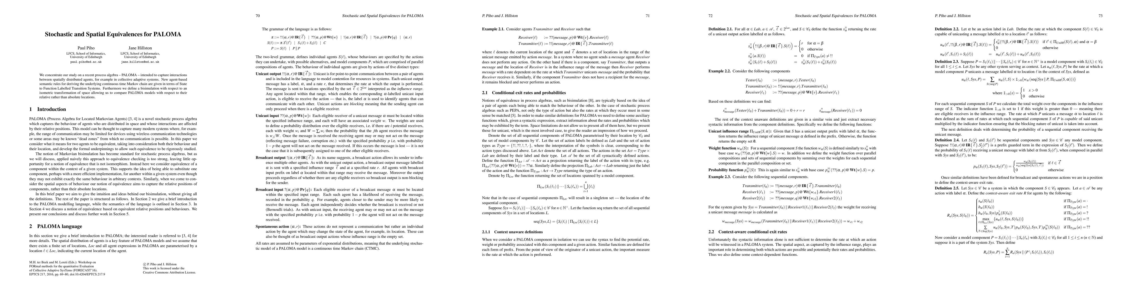 We concentrate our study on a recent process algebra - PALOMA - intended to capture interactions between spatially distributed agents, for example in collective adaptive systems. New agent-based semantic rules for deriving the underlying continuous time Markov chain are given in terms of State to Function Labelled Transition Systems. Furthermore we define a bisimulation with respect to an isometric transformation of space allowing us to compare PALOMA models with respect to their relative rather than absolute locations.