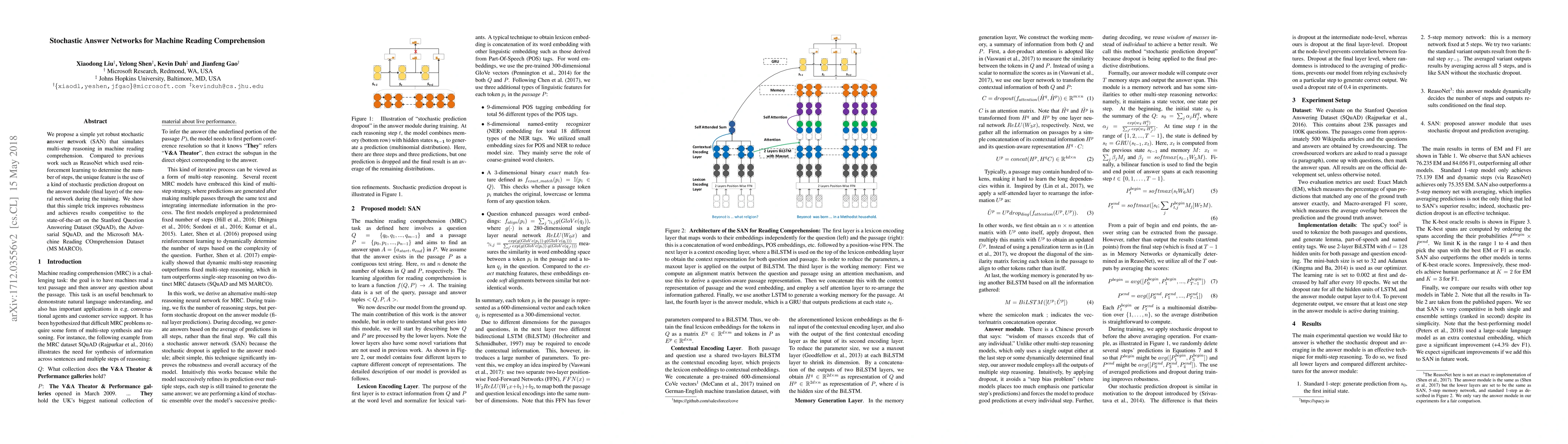 The paper introduces a Stochastic Answer Network (SAN) that enhances machine reading comprehension through multi-step reasoning, employing stochastic prediction dropout during training to improve robustness. This approach achieves competitive results on several datasets, including SQuAD, Adversarial SQuAD, and MS MARCO.