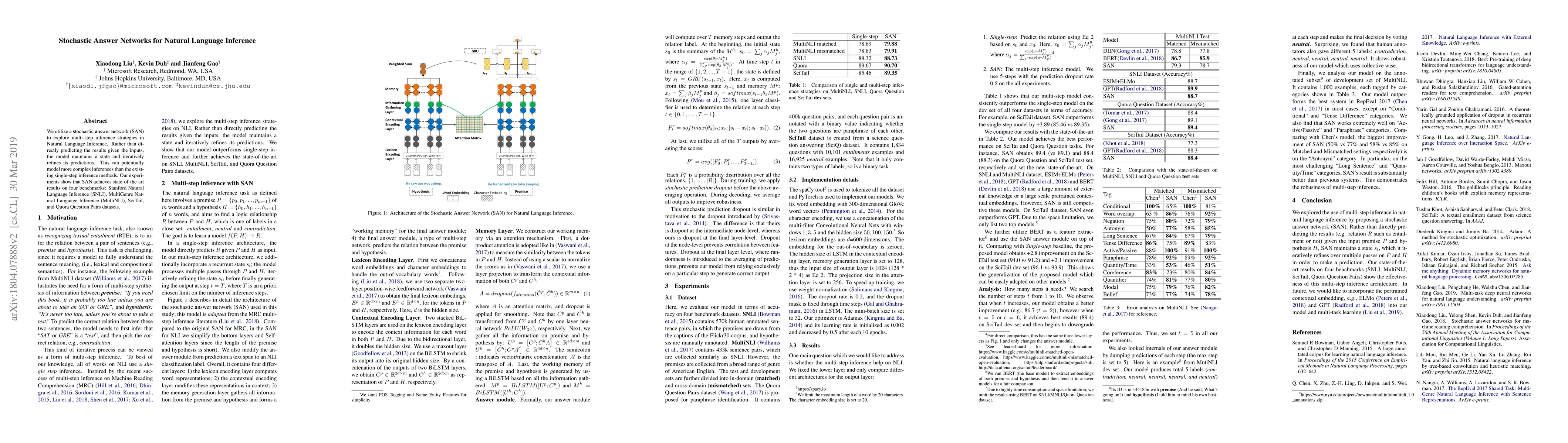 The paper introduces a stochastic answer network (SAN) that uses iterative prediction refinement for improved Natural Language Inference (NLI) performance. SAN achieves state-of-the-art results on SNLI, MultiNLI, and Quora Question Pairs datasets.