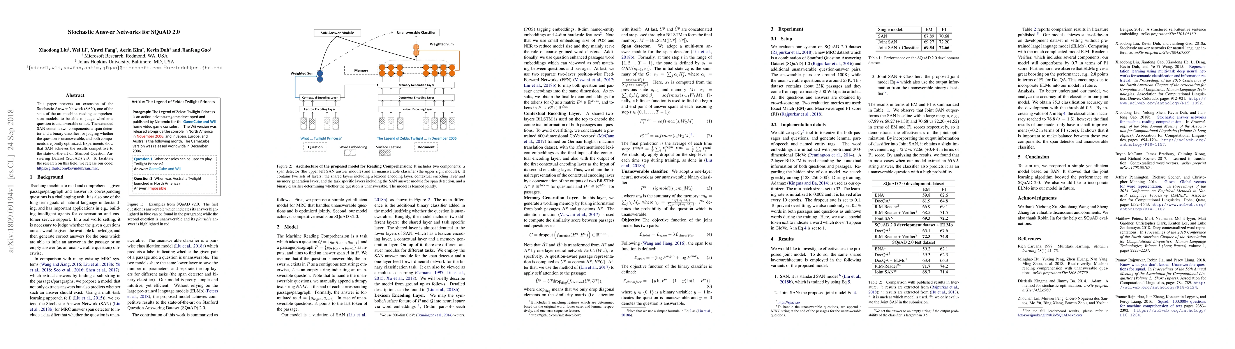 This paper extends the Stochastic Answer Network (SAN) to determine if questions in SQuAD 2.0 are unanswerable, incorporating a span detector and a binary classifier. Experiments demonstrate competitive performance on the dataset, and the authors release their code for further research.