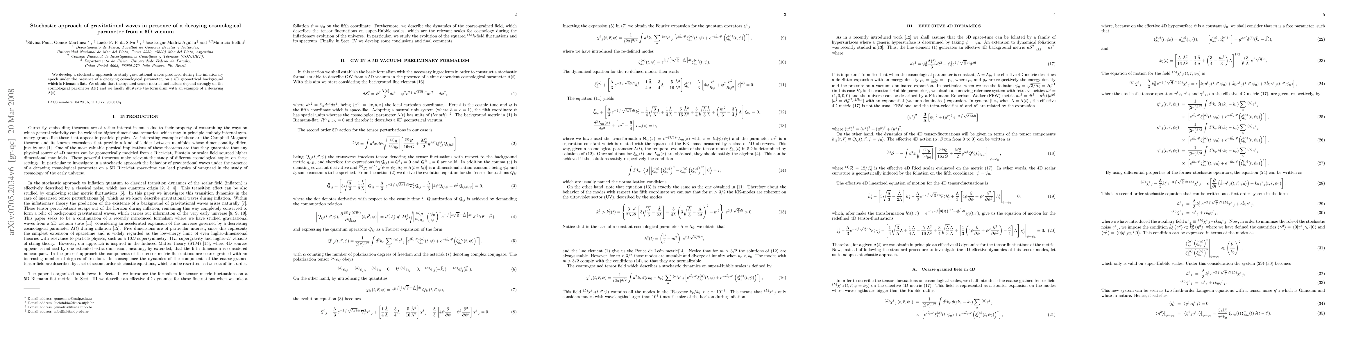 This paper proposes a stochastic method to investigate gravitational waves generated during inflation, considering a decaying cosmological parameter within a 5D Riemann-flat vacuum theory. The study finds that tensor metric fluctuations are significantly influenced by the time-dependent cosmological parameter $\Lambda(t)$.