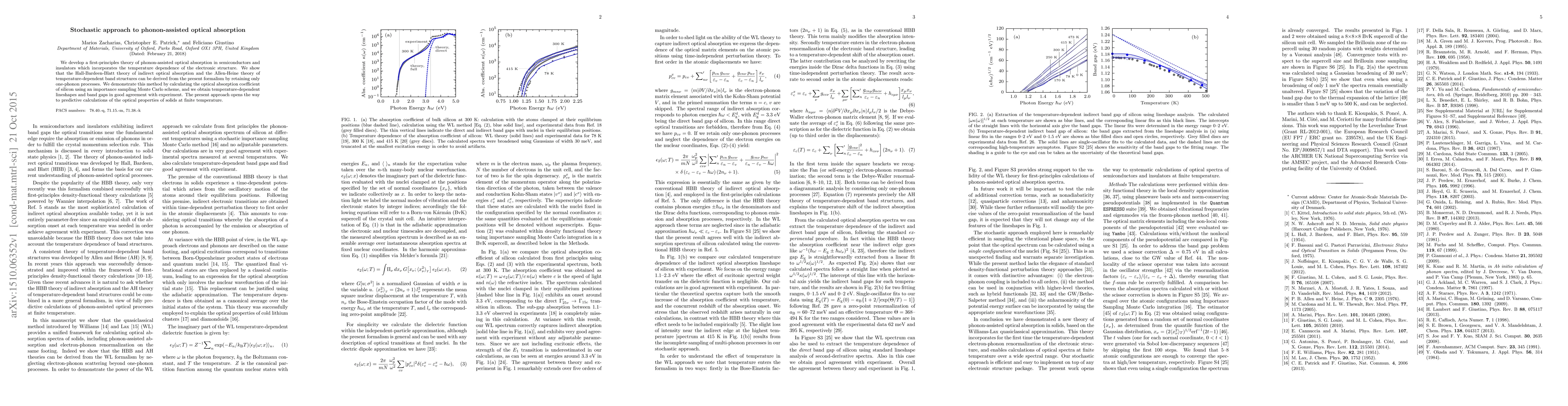 The paper presents a first-principles theory for phonon-assisted optical absorption in semiconductors and insulators, showing compatibility with existing theories by focusing on one-phonon processes. It employs a Monte Carlo scheme to calculate silicon's optical absorption, achieving good agreement with experimental data and paving the way for predictive optical property calculations at finite temperatures.