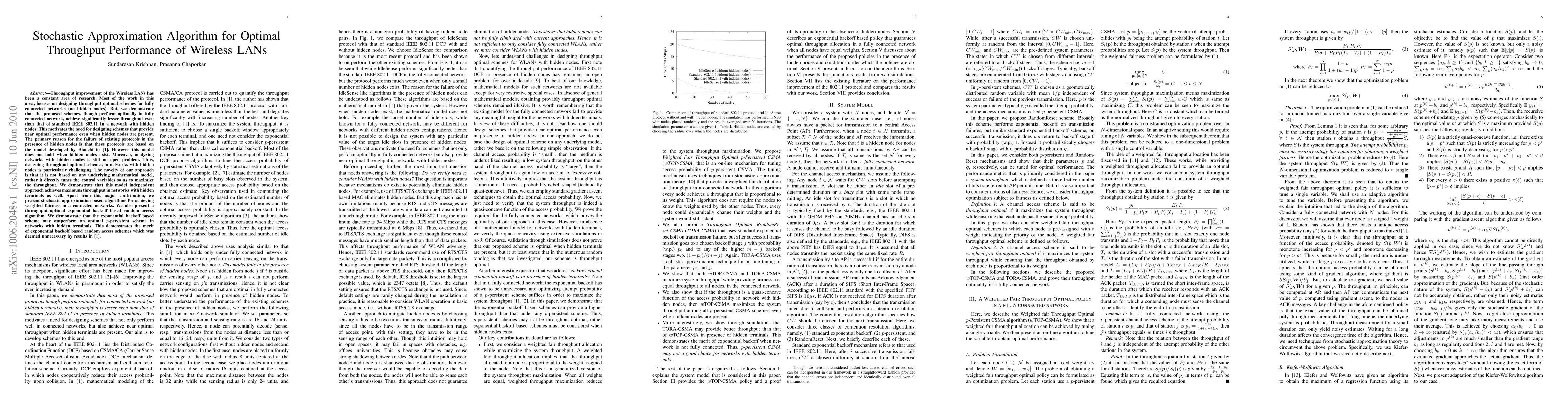 Throughput improvement of the Wireless LANs has been a constant area of research. Most of the work in this area, focuses on designing throughput optimal schemes for fully connected networks (no hidden nodes). But, we demonstrate that the proposed schemes, though perform optimally in fully connected network, achieve significantly lesser throughput even than that of standard IEEE 802.11 in a network with hidden nodes. This motivates the need for designing schemes that provide near optimal performance even when hidden nodes are present. The primary reason for the failure of existing protocols in the presence of hidden nodes is that these protocols are based on the model developed by Bianchi. However this model does not hold when hidden nodes exist. Moreover, analyzing networks with hidden nodes is still an open problem. Thus, designing throughput optimal schemes in networks with hidden nodes is particularly challenging. The novelty of our approach is that it is not based on any underlying mathematical model, rather it directly tunes the control variables so as to maximize the throughput. We demonstrate that this model independent approach achieves maximum throughput in networks with hidden terminals as well. Apart from this major contribution, we present stochastic approximation based algorithms for achieving weighted fairness in a connected networks. We also present a throughput optimal exponential backoff based random access algorithm. We demonstrate that the exponential backoff based scheme may outperform an optimal p-persistent scheme in networks with hidden terminals. This demonstrates the merit of exponential backoff based random access schemes which was deemed unnecessary by results shown by Bianchi.