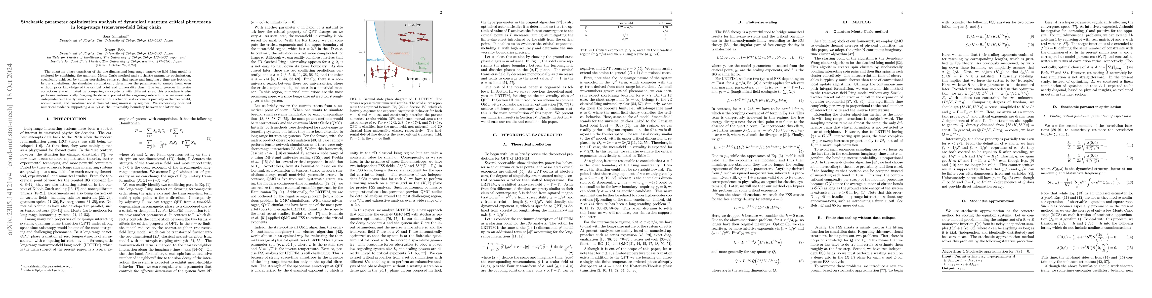 This paper investigates quantum phase transitions in the long-range transverse-field Ising model using quantum Monte Carlo simulations with optimized stochastic approximation. It finds that the dynamical critical exponent and other critical exponents vary across mean-field, nonuniversal, and Ising regimes, and highlights the computational efficiency of the method over traditional finite-size scaling.