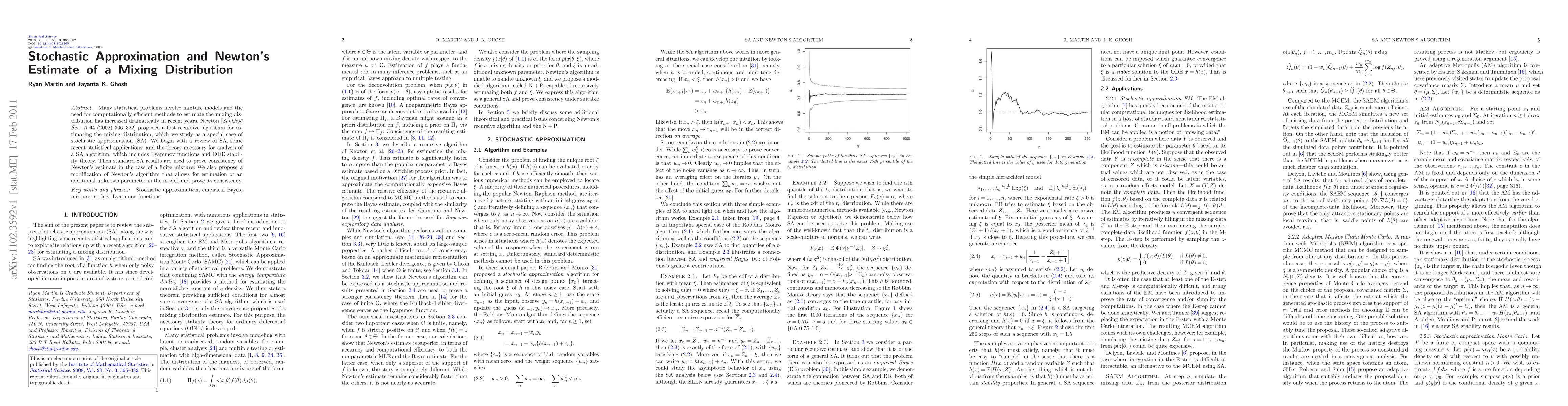 This paper develops a stochastic approximation framework to estimate mixing distributions in mixture models, improving upon Newton's original algorithm with modifications that allow for estimation of additional unknown parameters.