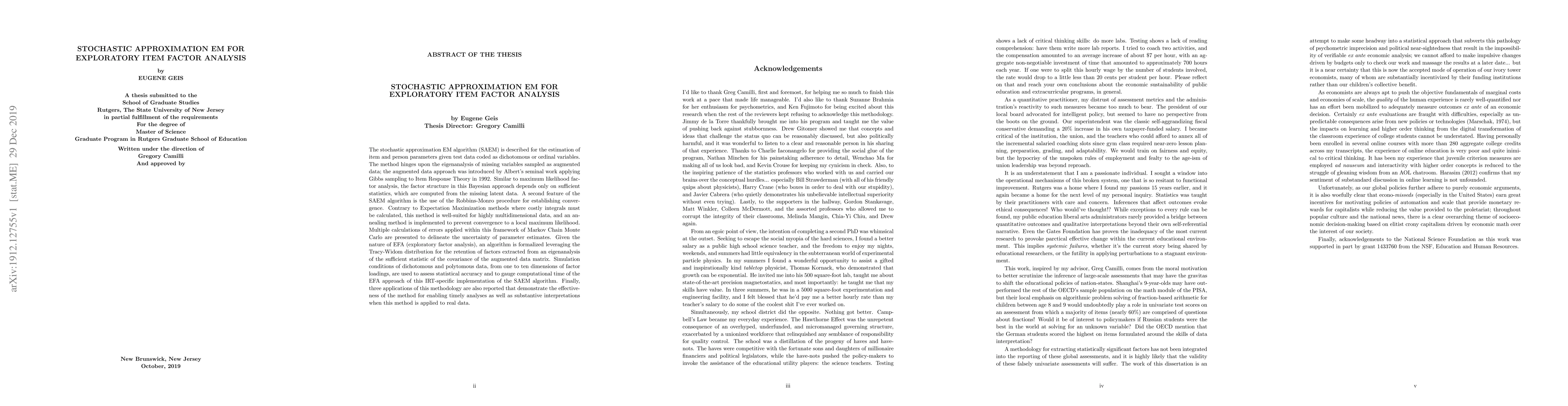 The paper presents a stochastic approximation EM algorithm (SAEM) for estimating item and person parameters in exploratory item factor analysis using dichotomous or ordinal data. The method leverages augmented data and the Robbins-Monro procedure for convergence, and it is shown to be effective for high-dimensional data through simulations and real-data applications.