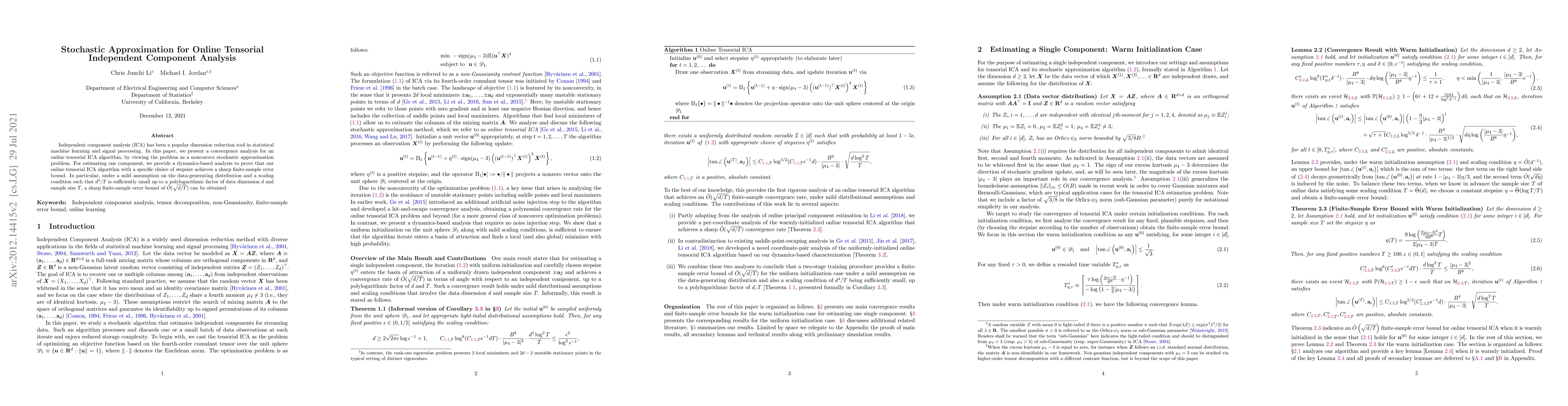 This paper presents a convergence analysis for an online tensorial ICA algorithm framed as a nonconvex stochastic approximation problem, achieving a sharp finite-sample error bound of $\tilde{O}(\sqrt{d/T})$ under mild assumptions and a scaling condition. The analysis provides a dynamics-based proof for estimating one component.