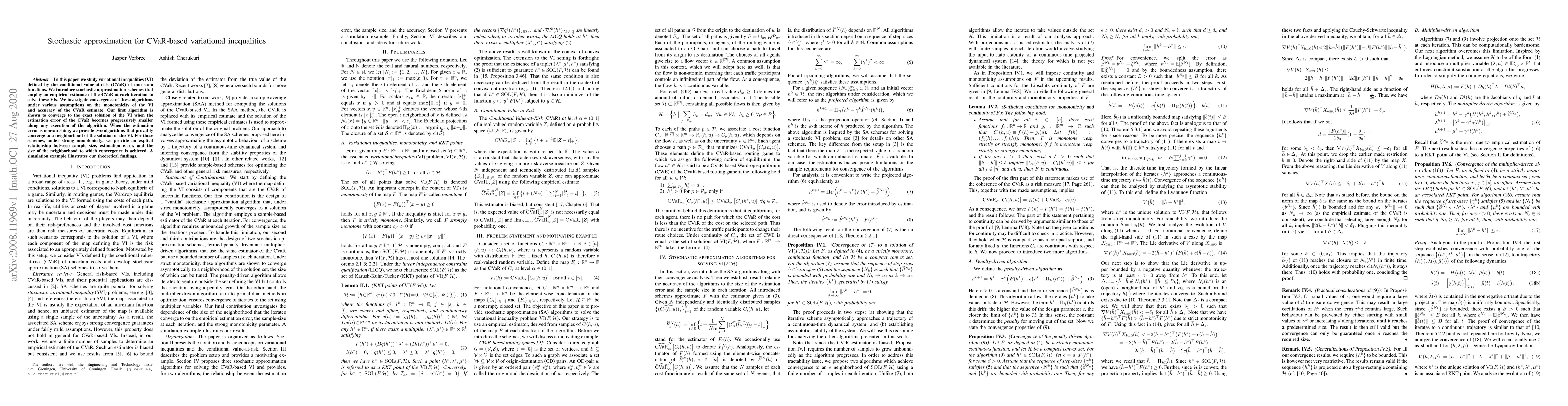 This paper introduces stochastic approximation methods to solve CVaR-based variational inequalities using empirical CVaR estimates. The algorithms converge to the exact solution when the CVaR estimation error diminishes, and to a solution neighborhood when the error is nonvanishing, with explicit convergence bounds under strong monotonicity.