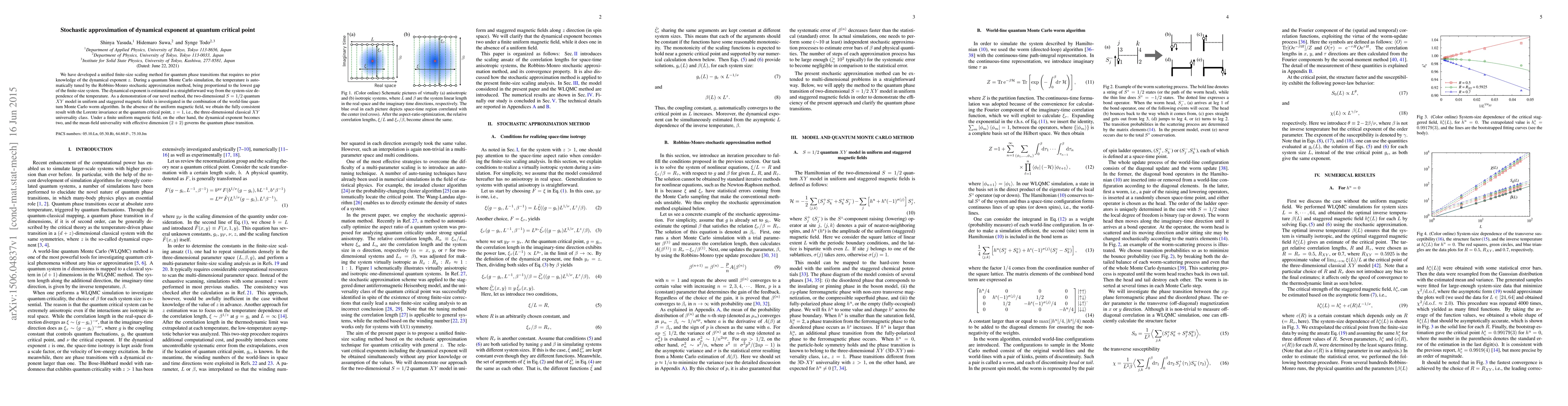 We have developed a unified finite-size scaling method for quantum phase transitions that requires no prior knowledge of the dynamical exponent $z$. During a quantum Monte Carlo simulation, the temperature is automatically tuned by the Robbins-Monro stochastic approximation method, being proportional to the lowest gap of the finite-size system. The dynamical exponent is estimated in a straightforward way from the system-size dependence of the temperature. As a demonstration of our novel method, the two-dimensional $S=1/2$ quantum $XY$ model in uniform and staggered magnetic fields is investigated in the combination of the world-line quantum Monte Carlo worm algorithm. In the absence of the uniform magnetic field, we obtain the fully consistent result with the Lorentz invariance at the quantum critical point, $z=1$, i.e., the three-dimensional classical $XY$ universality class. Under a finite uniform magnetic field, on the other hand, the dynamical exponent becomes two, and the mean-field universality with effective dimension $(2+2)$ governs the quantum phase transition.
