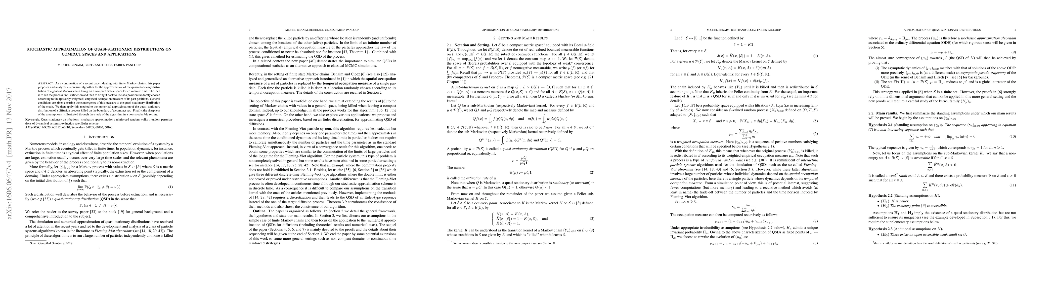 This paper proposes a recursive algorithm for approximating the quasi-stationary distribution of Markov chains on compact spaces, ensuring convergence to the desired distribution. It applies the method to diffusion processes and estimates spectral gaps, while also examining the algorithm's performance in non-irreducible settings.