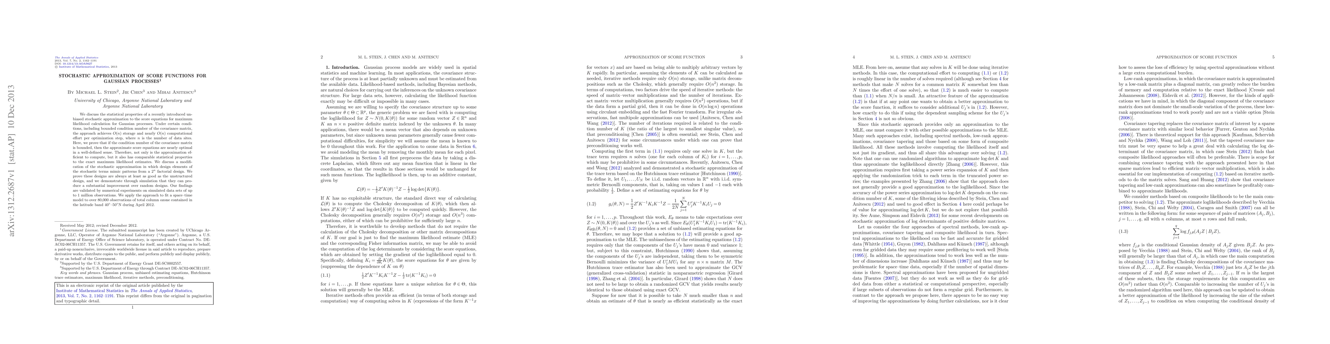 We discuss the statistical properties of a recently introduced unbiased stochastic approximation to the score equations for maximum likelihood calculation for Gaussian processes. Under certain conditions, including bounded condition number of the covariance matrix, the approach achieves $O(n)$ storage and nearly $O(n)$ computational effort per optimization step, where $n$ is the number of data sites. Here, we prove that if the condition number of the covariance matrix is bounded, then the approximate score equations are nearly optimal in a well-defined sense. Therefore, not only is the approximation efficient to compute, but it also has comparable statistical properties to the exact maximum likelihood estimates. We discuss a modification of the stochastic approximation in which design elements of the stochastic terms mimic patterns from a $2^n$ factorial design. We prove these designs are always at least as good as the unstructured design, and we demonstrate through simulation that they can produce a substantial improvement over random designs. Our findings are validated by numerical experiments on simulated data sets of up to 1 million observations. We apply the approach to fit a space-time model to over 80,000 observations of total column ozone contained in the latitude band $40^{\circ}$-$50^{\circ}$N during April 2012.