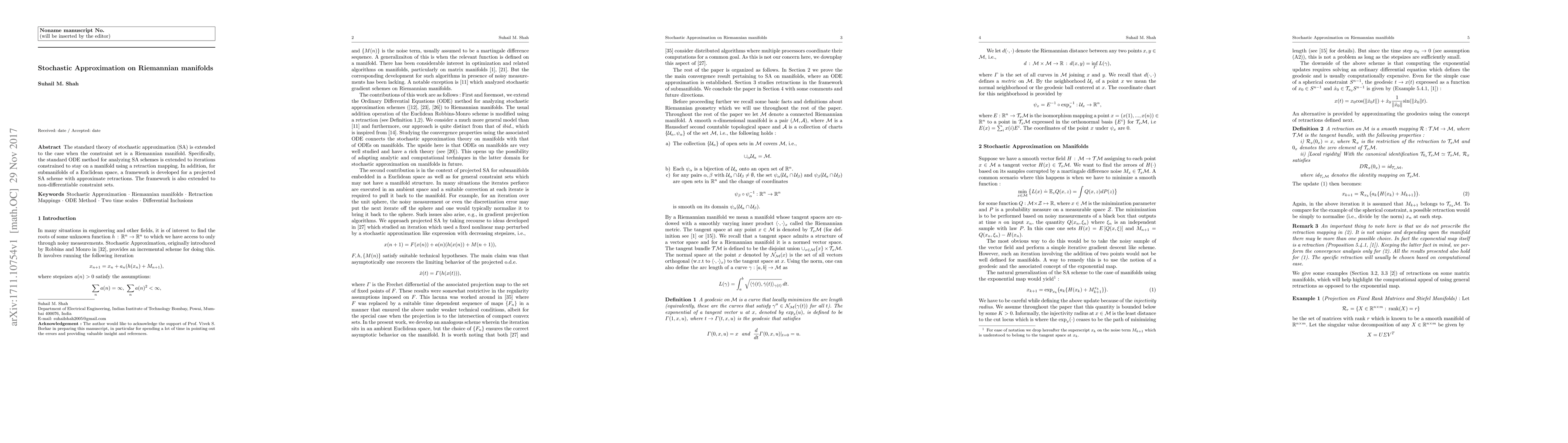 The standard theory of stochastic approximation (SA) is extended to the case when the constraint set is a Riemannian manifold. Specifically, the standard ODE method for analyzing SA schemes is extended to iterations constrained to stay on a manifold using a retraction mapping. In addition, for submanifolds of a Euclidean space, a framework is developed for a projected SA scheme with approximate retractions. The framework is also extended to non-differentiable constraint sets.