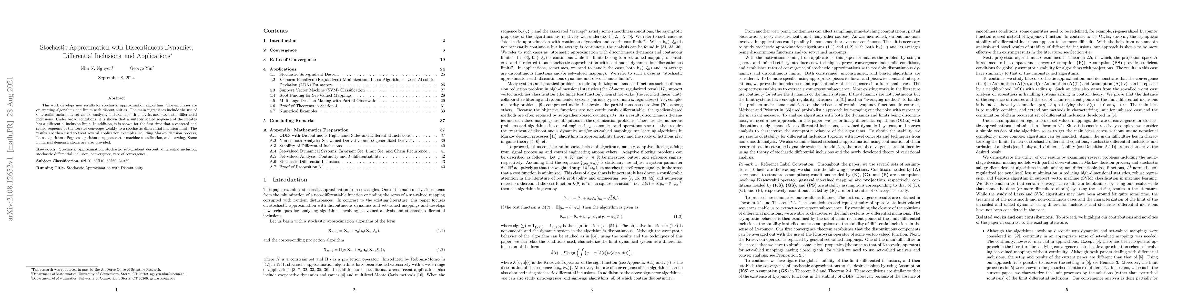 The paper develops new results for stochastic approximation algorithms, focusing on treating algorithms and limits with discontinuities using differential inclusions, set-valued analysis, non-smooth analysis, and stochastic differential inclusions.