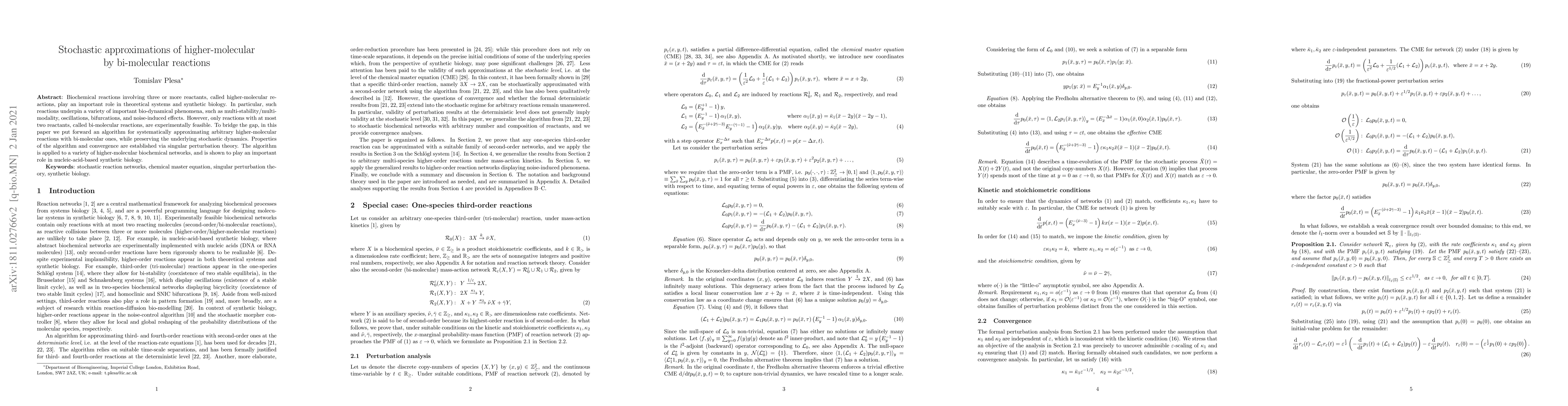 Biochemical reactions involving three or more reactants, called higher-molecular reactions, play an important role in theoretical systems and synthetic biology. In particular, such reactions underpin a variety of important bio-dynamical phenomena, such as multi-stability/multi-modality, oscillations, bifurcations, and noise-induced effects. However, only reactions with at most two reactants, called bi-molecular reactions, are experimentally feasible. To bridge the gap, in this paper we put forward an algorithm for systematically approximating arbitrary higher-molecular reactions with bi-molecular ones, while preserving the underlying stochastic dynamics. Properties of the algorithm and convergence are established via singular perturbation theory. The algorithm is applied to a variety of higher-molecular biochemical networks, and is shown to play an important role in nucleic-acid-based synthetic biology.