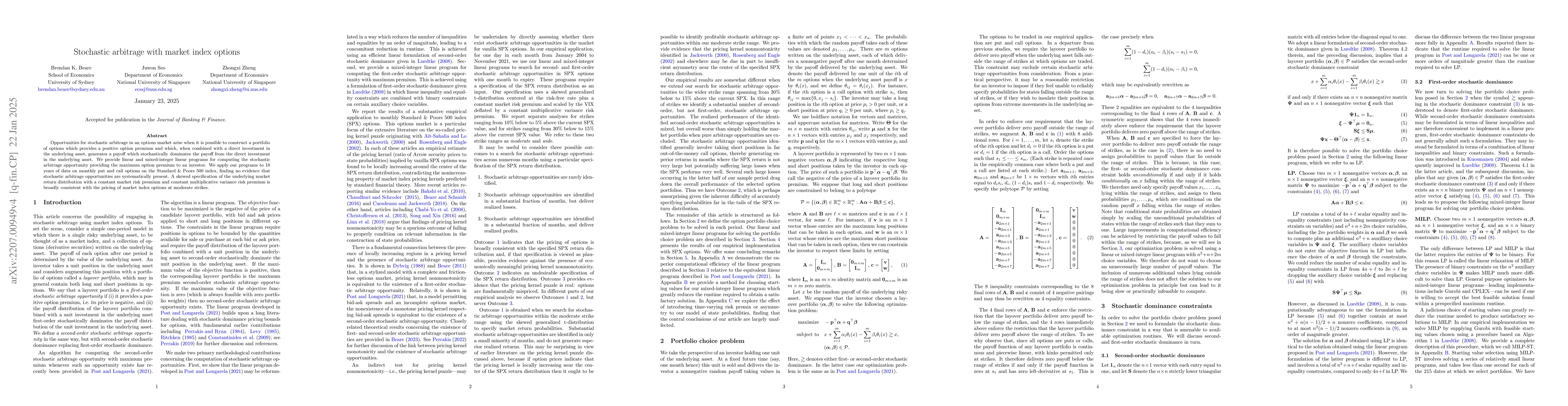 Opportunities for stochastic arbitrage in an options market arise when it is possible to construct a portfolio of options which provides a positive option premium and which, when combined with a direct investment in the underlying asset, generates a payoff which stochastically dominates the payoff from the direct investment in the underlying asset. We provide linear and mixed-integer linear programs for computing the stochastic arbitrage opportunity providing the maximum option premium to an investor. We apply our programs to 18 years of data on monthly put and call options on the Standard & Poors 500 index, confining attention to options with moderate moneyness, and using two specifications of the underlying asset return distribution, one symmetric and one skewed. The pricing of market index options with moderate moneyness appears to be broadly consistent with our skewed specification of market returns.