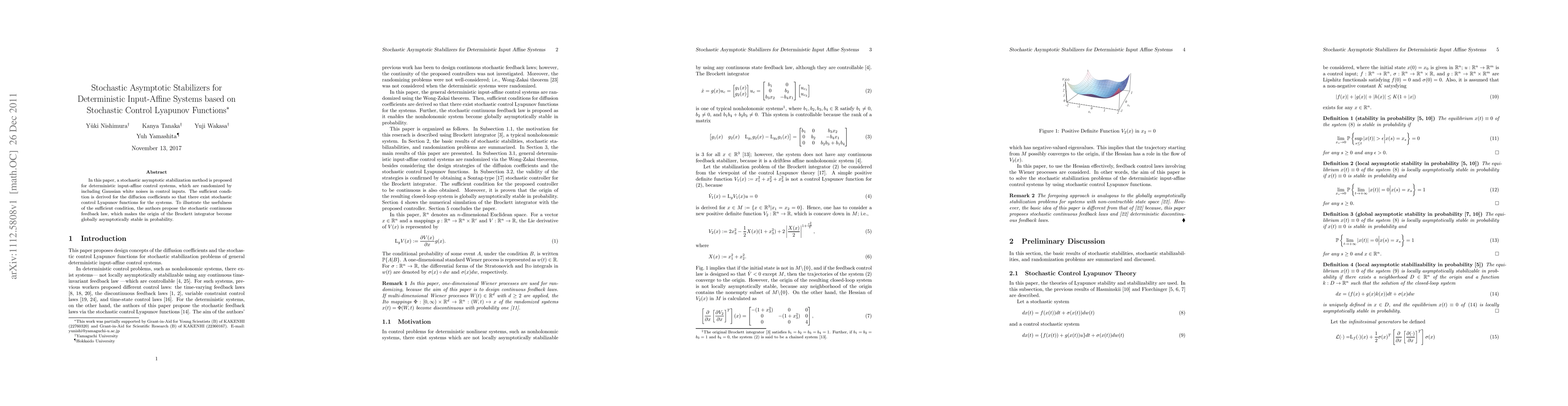 In this paper, a stochastic asymptotic stabilization method is proposed for deterministic input-affine control systems, which are randomized by including Gaussian white noises in control inputs. The sufficient condition is derived for the diffucion coefficients so that there exist stochastic control Lyapunov functions for the systems. To illustrate the usefulness of the sufficient condition, the authors propose the stochastic continuous feedback law, which makes the origin of the Brockett integrator become globally asymptotically stable in probability.
