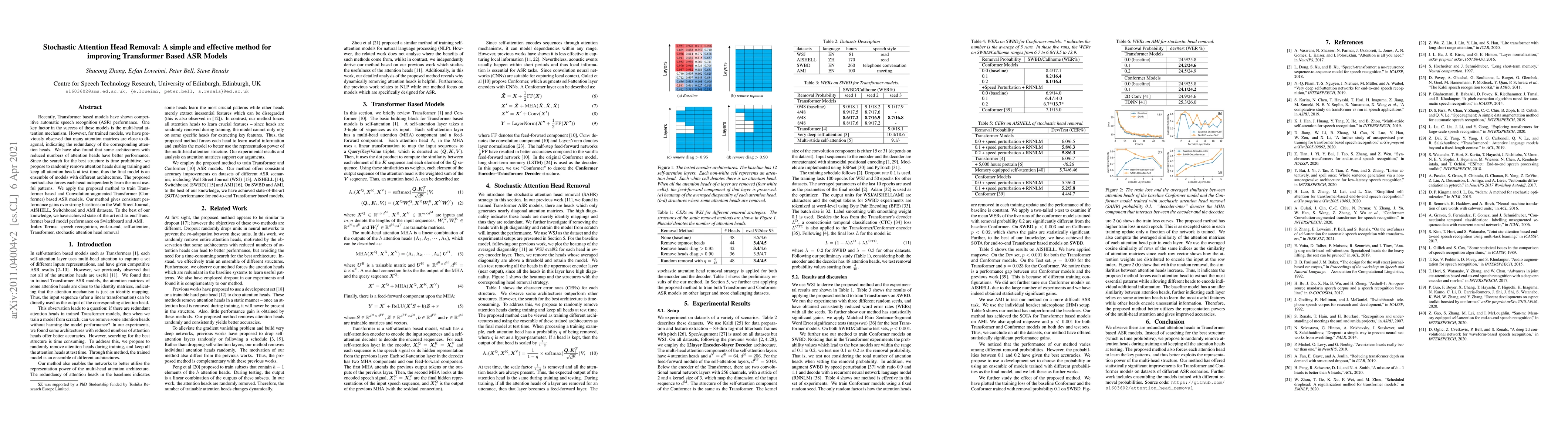 This paper proposes a method to improve Transformer-based ASR models by randomly removing attention heads during training, resulting in consistent performance gains and state-of-the-art results on Switchboard and AMI datasets. This approach encourages independent learning of useful patterns by each attention head.