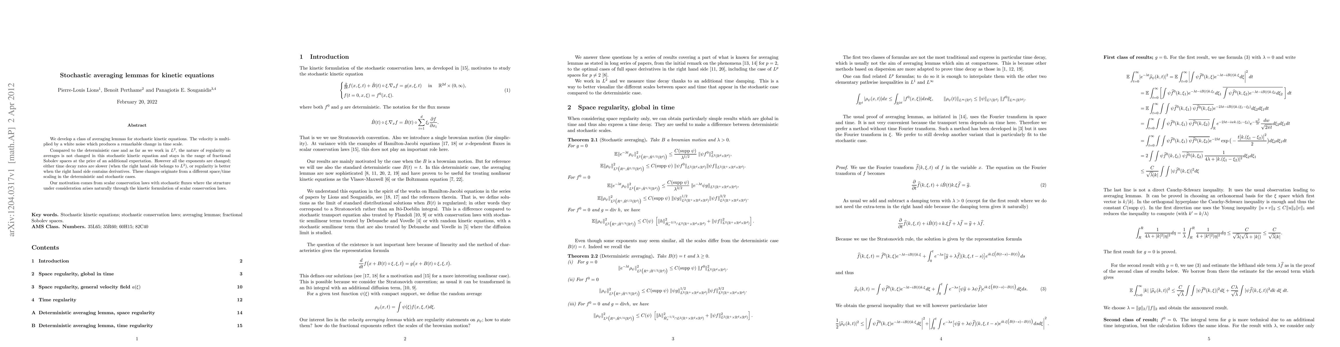 This paper develops averaging lemmas for stochastic kinetic equations where white noise alters the time scale. The study finds that while regularity in $L^2$ remains within fractional Sobolev spaces, the exponents change, leading to slower time decay or improved regularity depending on the right-hand side's properties, due to different space/time scaling in deterministic versus stochastic cases.