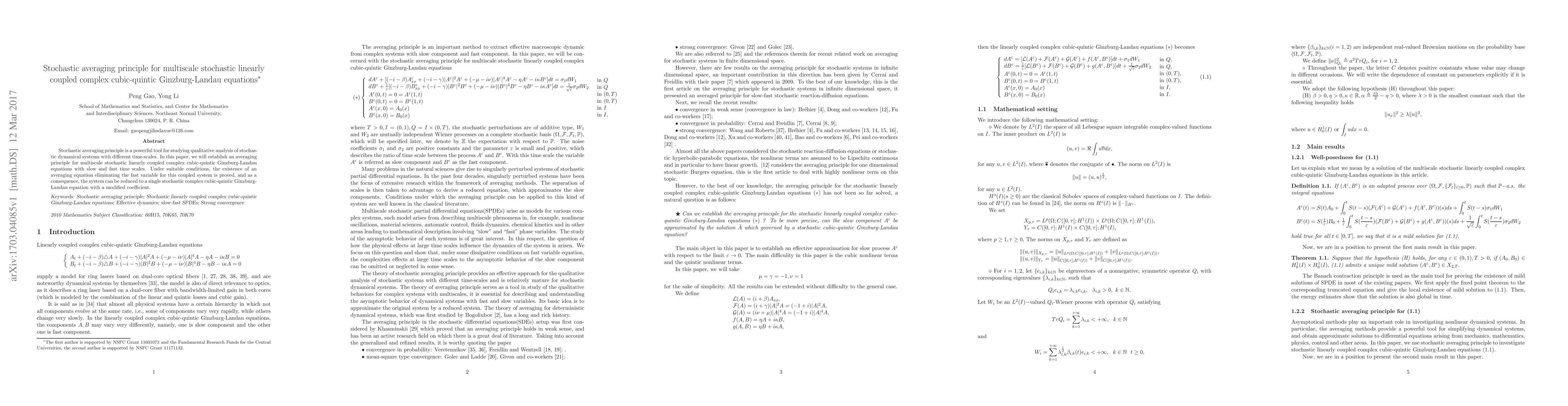 This paper establishes a stochastic averaging principle for multiscale stochastic linearly coupled complex cubic-quintic Ginzburg-Landau equations, proving the existence of an averaging equation that simplifies the system to a single stochastic equation with modified coefficients. The method effectively eliminates the fast time scale variables.