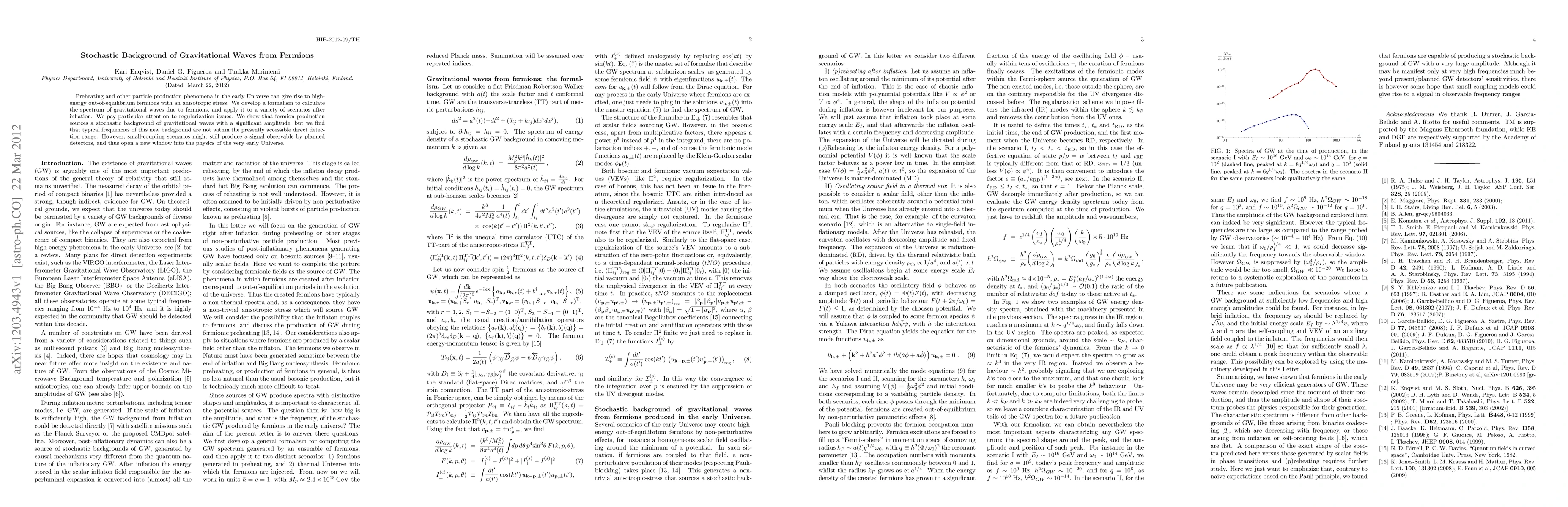 Preheating and other particle production phenomena in the early Universe can give rise to high- energy out-of-equilibrium fermions with an anisotropic stress. We develop a formalism to calculate the spectrum of gravitational waves due to fermions, and apply it to a variety of scenarios after inflation. We pay particular attention to regularization issues. We show that fermion production sources a stochastic background of gravitational waves with a significant amplitude, but we find that typical frequencies of this new background are not within the presently accessible direct detec- tion range. However, small-coupling scenarios might still produce a signal observable by planned detectors, and thus open a new window into the physics of the very early Universe.