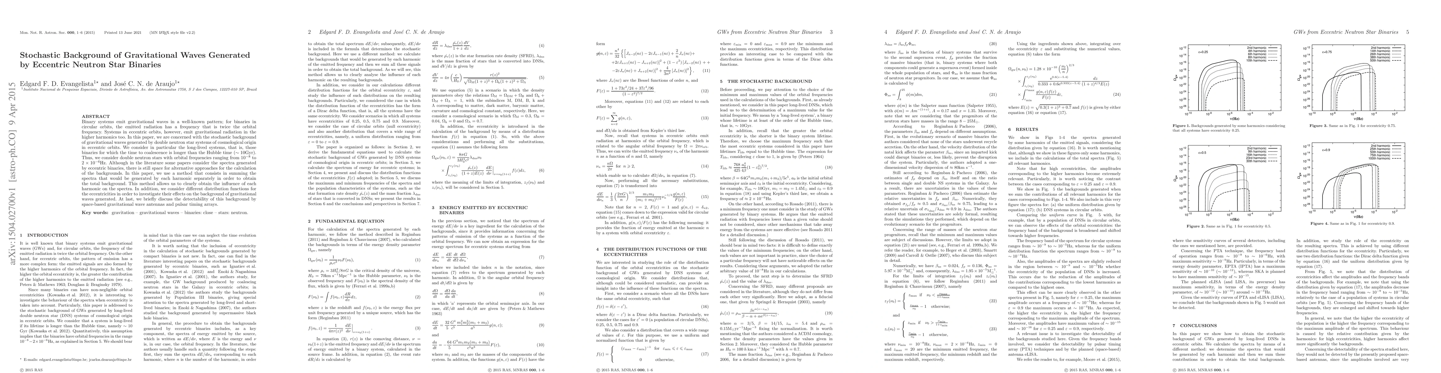 This paper investigates the stochastic background of gravitational waves from eccentric neutron star binaries, focusing on long-lived systems with cosmological origins. It proposes a method to sum individual harmonic spectra to determine the total background, considering various eccentricity distributions and discussing the potential detection by space-based detectors and pulsar timing arrays.