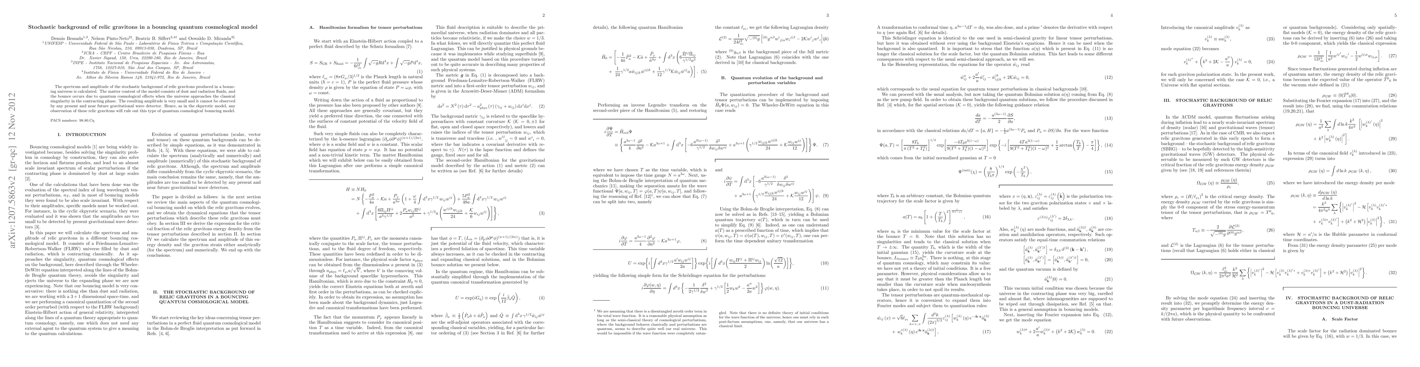 This paper calculates the spectrum and amplitude of relic gravitons in a bouncing quantum cosmological model featuring dust and radiation, showing that the amplitude is too small for current or near-future gravitational wave detectors to observe. Any future detection would thus rule out this model.